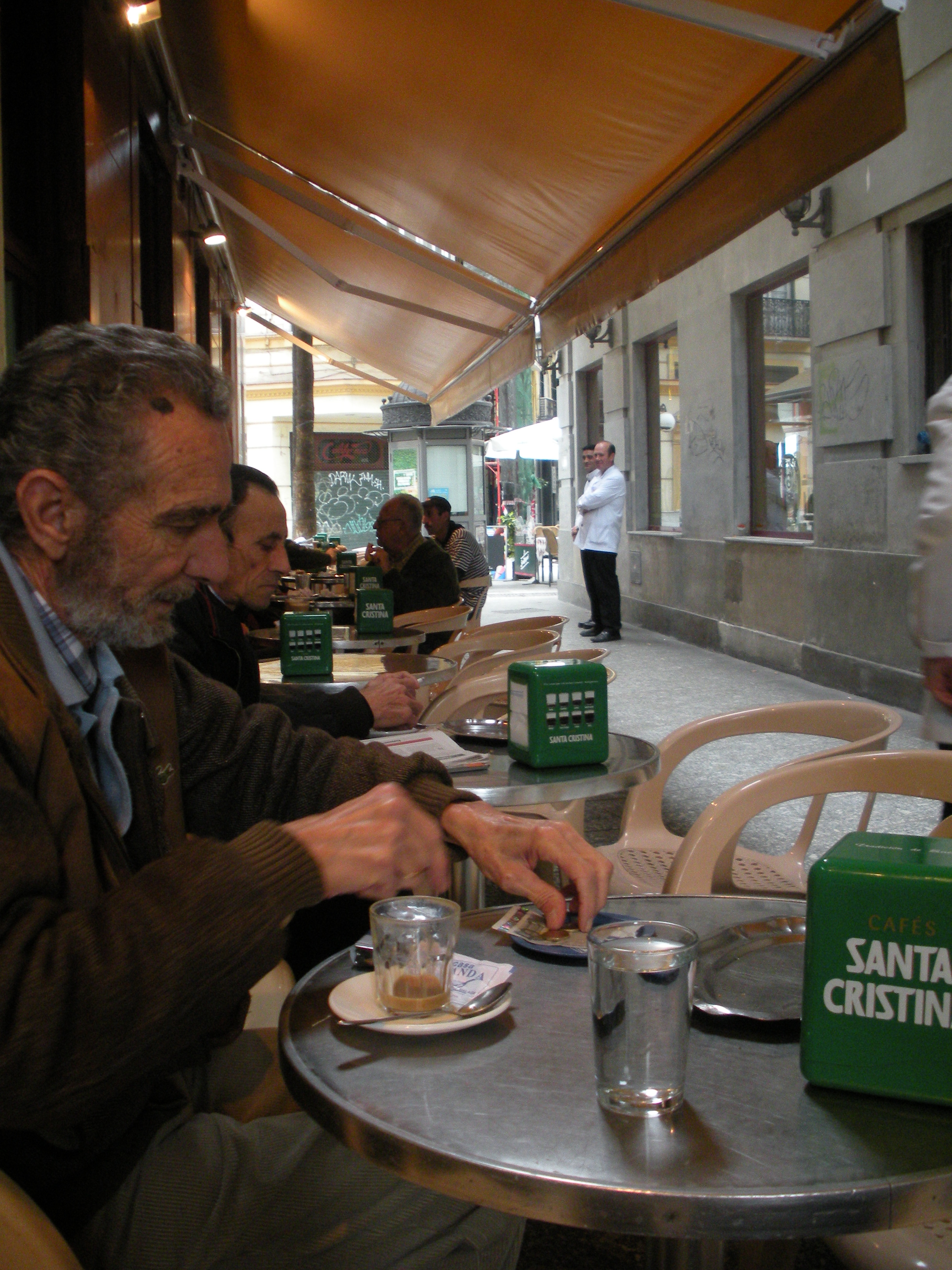 The fun thing about this place is that it’s like the Spain that I lived in more than 30 years ago. Nothing is automated.  Our bartender(right) kept track of our bill by writing the amounts of our wines in chalk on the counter in front of us.  When the customer is done, he adds it up, the customer pays and then he wipes it clean so he can start again with a new customer.