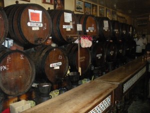One place that I read more about after our first trip to Málaga was Antigua Casa de Guardia for Malagueñan sweet wine.  We needed to check it out.  And what did we find? An old, stand-up type bar with many barrels against the wall, stacked 3 high. Wine is all that they serve too. I had jotted a couple of the names of wines that I wanted to try and confidently asked the waiter for the first one.  Yummy!! Can I have some more please?