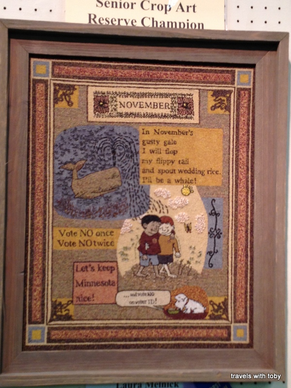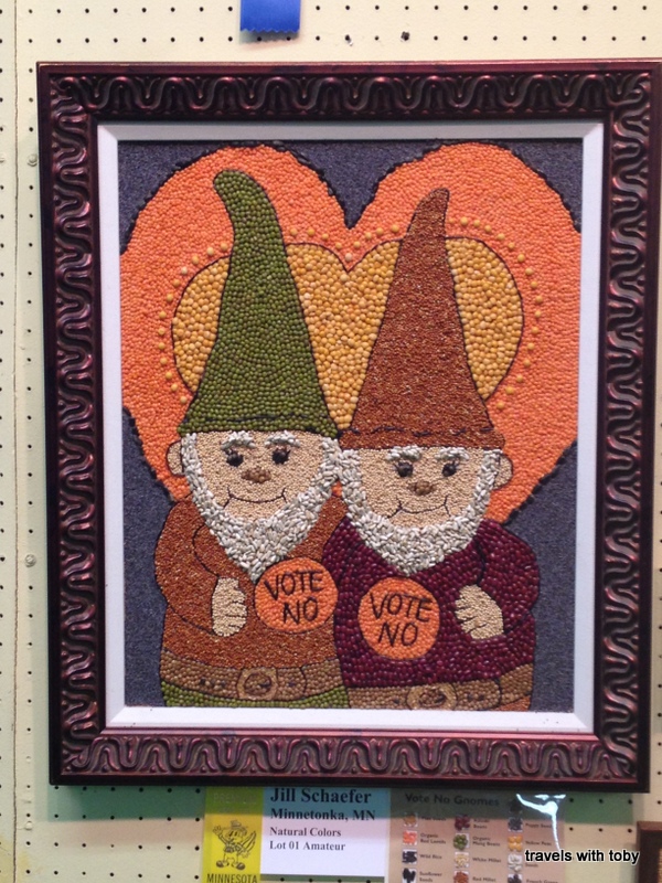 We always start in the ag building or the Agriculture Horticulture Building officially. We never miss the seed art display and this year’s entries were great once again. There are always several politically charged pieces and this year we had many regarding the marriage amendment on our ballot this fall.