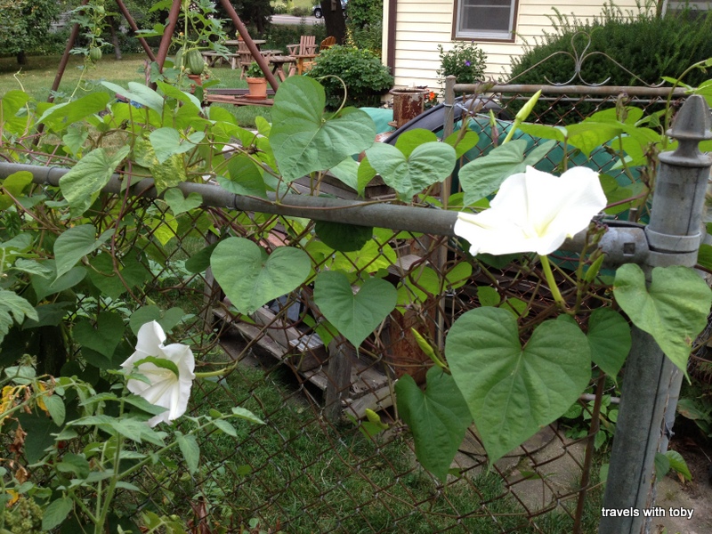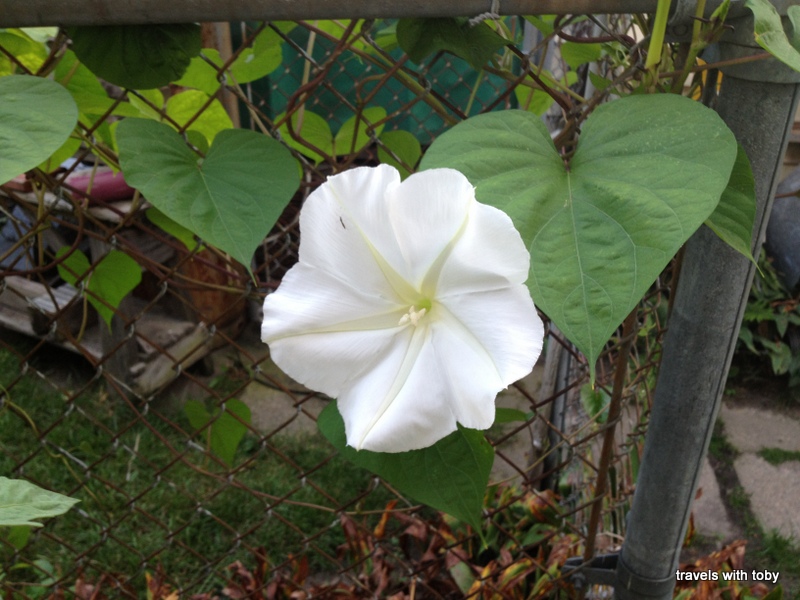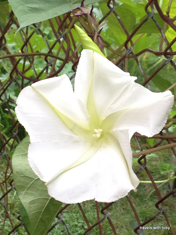 And now for the most amazing flower that finally bloomed mid to late August, the moonflower.  It’s very similar to the morning glory in that the flowers bloom once and they’re done.  However, there are lots and lots of buds so it doesn’t really seem that they bloom only once.  They could be considered the opposite of the morning glory as the moonflower blooms in the evening and then closes up some time the next morning.  The one big difference between morning glories and moonflowers is that the latter has the most wonderful scent.  Please enjoy these few shots of my moonflowers.