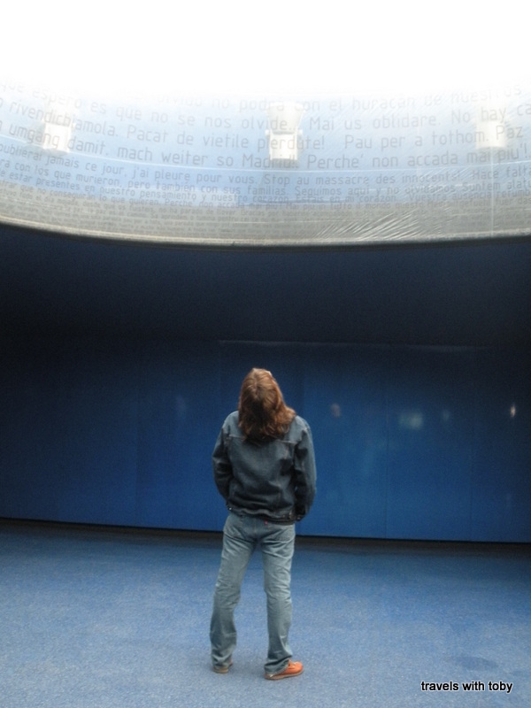 The memorial to the victims of the attack at the Atocha train station was very moving. It’s a large room with blue walls. The memorial is above you, messages from around the world and in many different languages to the people of Madrid following their horrendous tragedy on March 11, 2004. These messages are inscribed on glass and circle above you: