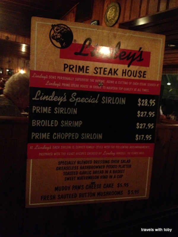 One of our favorite local eateries is Lindey’s Prime Steak House.  We usually go there for special occasions and we went last night to celebrate hubby’s great review and bonus at work.  This restaurant is very unlike the Pickwick where we ate last weekend in Duluth.  At Lindey’s their menu is very small: