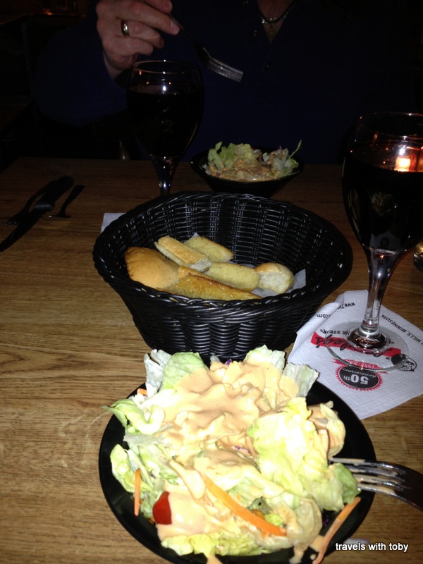 At Lindey’s you choose your meat or shrimp and you can choose to have sauteed mushrooms or not.  The rest of the meal is the same for everyone.  You start with a basket of bread, a green salad that includes one cherry tomato and is topped with their specially blended Thousand Island dressing: