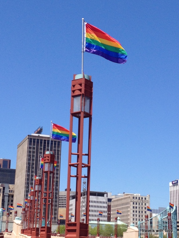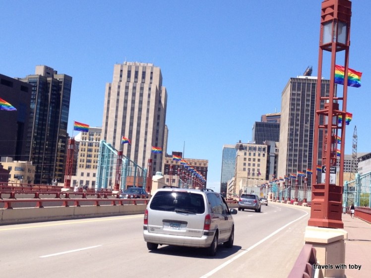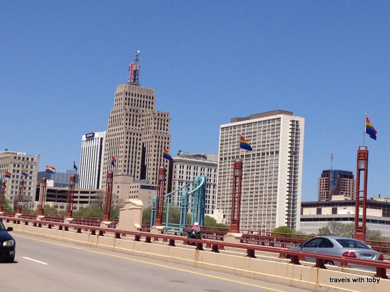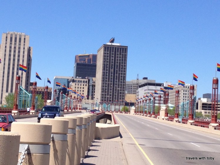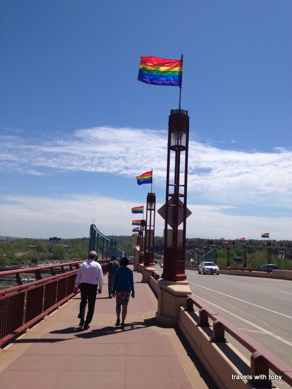 I love the skyways but it’s also fun to walk about outside as well, as long as the weather holds up ;) There are nice parks to stroll through as well as rivers to cross on bridges.  The Wabasha Street bridge is usually decorated with American flags.  But during the week that gay marriage was voted on and signed into law, rainbow flags graced the bridge the entire week.  And as luck would have it, the weather was very nice and I was able to take a walk across the bridge and take some photos.  Come along with me on a short tour of downtown St. Paul won’t you?