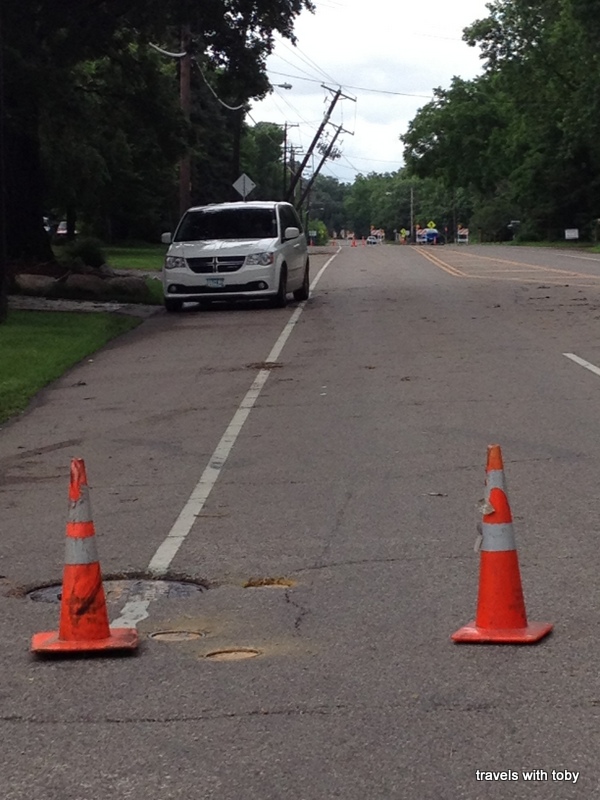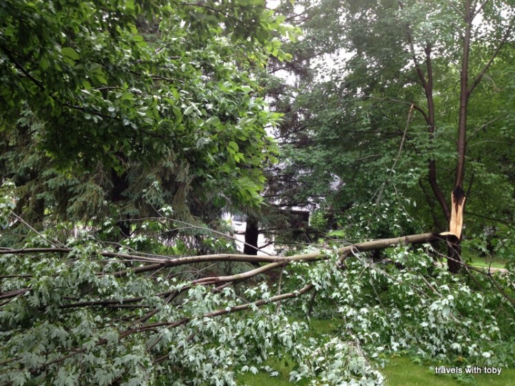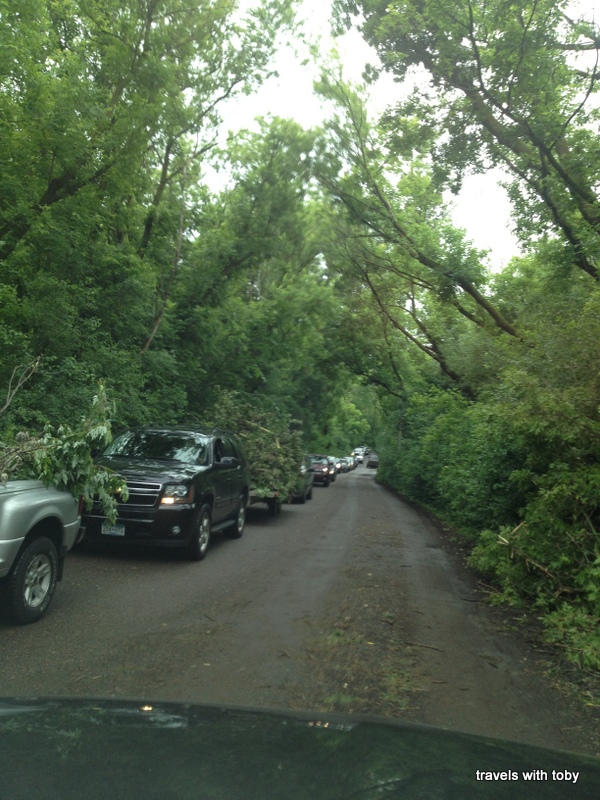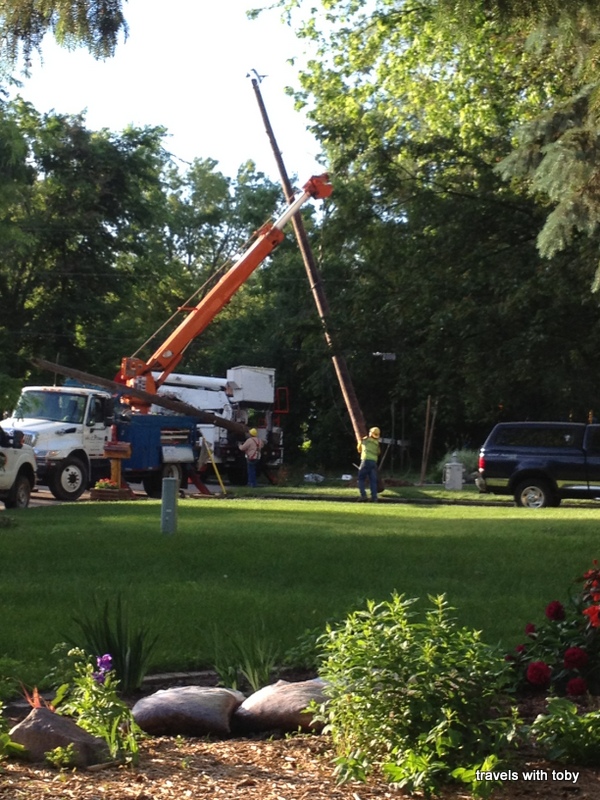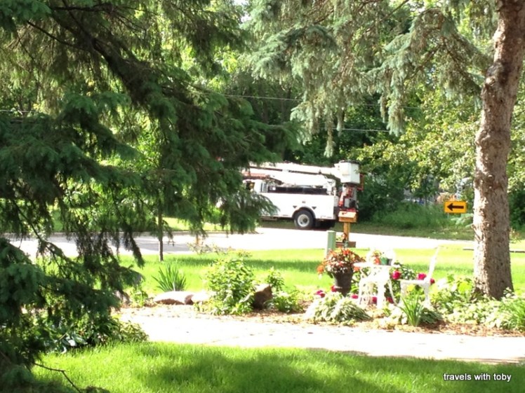 We filled in the time while waiting for the energy guys to fix our pole by mowing and just generally sitting around and doing nothing. Finally three guys show up in our neighbor’s yard “are you the energy guys?” Turns out they were from Michigan. I had heard that crews from 14 states had come to help with the hundreds of thousands of us, mostly in the twin cities metro, who were without power because of Friday night’s storm.  As of Saturday morning 250k customers were without power in the metro area.  By mid Saturday it was down to 112k, by Sunday morning closer to 100k.
