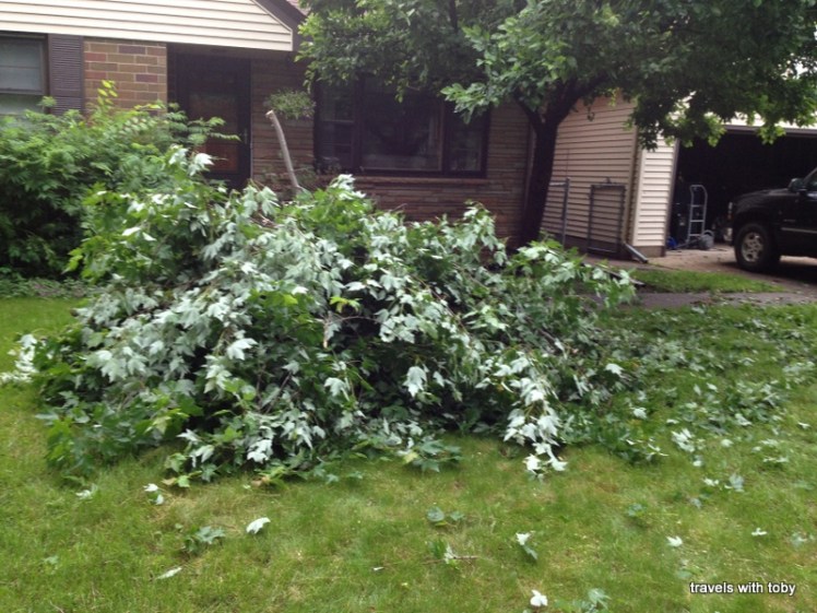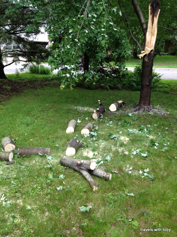 The next morning our neighbor came over and as soon as she saw our tree she yelled for her hubby to bring the chainsaw.  Thank goodness for neighbors with chainsaws is all I can say because I was starting to add up the cost of removing the maple.
