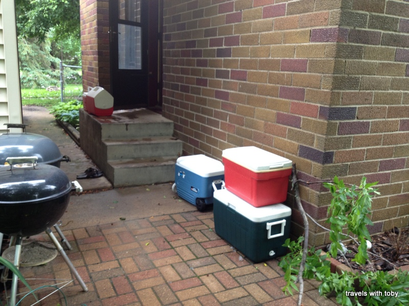 By Saturday afternoon when we still had no power we began removal of items in the fridge/freezer.  Luckily we were between meat purchases so only lost frozen potatoes and chicken nuggets, not much of either of those really.  Really thankful we didn’t lose more.  Had to toss most of a tub of chocolate ice cream and a brand new package of ice cream sandwiches.  I have two cups of pureed pumpkin from last fall and two cups of chopped rhubarb that I need to do something with soon.  Everything from the fridge and some frozen green pea soup went into coolers and we used 78 lbs. of ice last weekend: