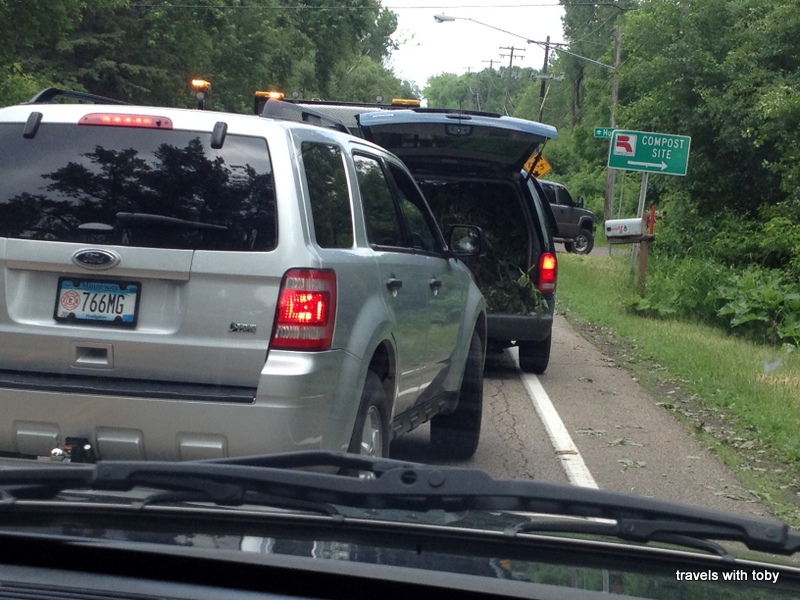 We had so much to bring to the brush site including other pieces of trees that had fallen into both yards that it took us two trips, both times we had to wait in line.  This is on the street before you turn onto the street that leads down to the brush site: