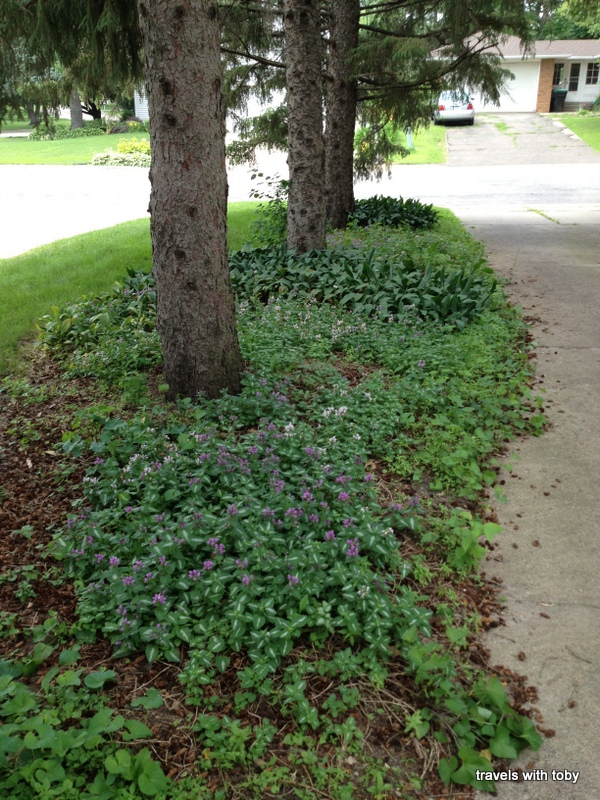 And here it is taking over under the evergreens. It’s duking it out with lily of the valley, another plant that likes to take over. I didn’t plant any of this lamium you see here: