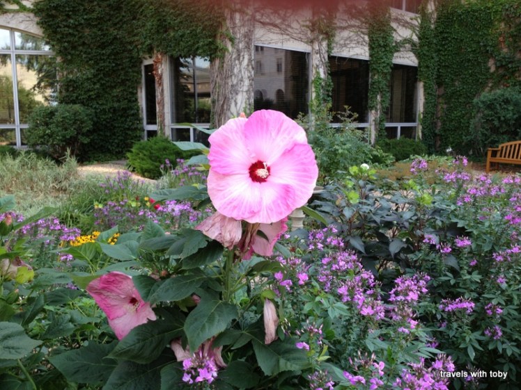 Next a couple of photos of what I’m guessing are hibiscus. I didn’t think they wintered here but my friend in Illinois tells me she has seen hibiscus there so guessing she is correct. There was another, bright red one in this same garden in front of the St. Paul Hotel. Alas, it was too windy to get that one and it was time to head back to the office: