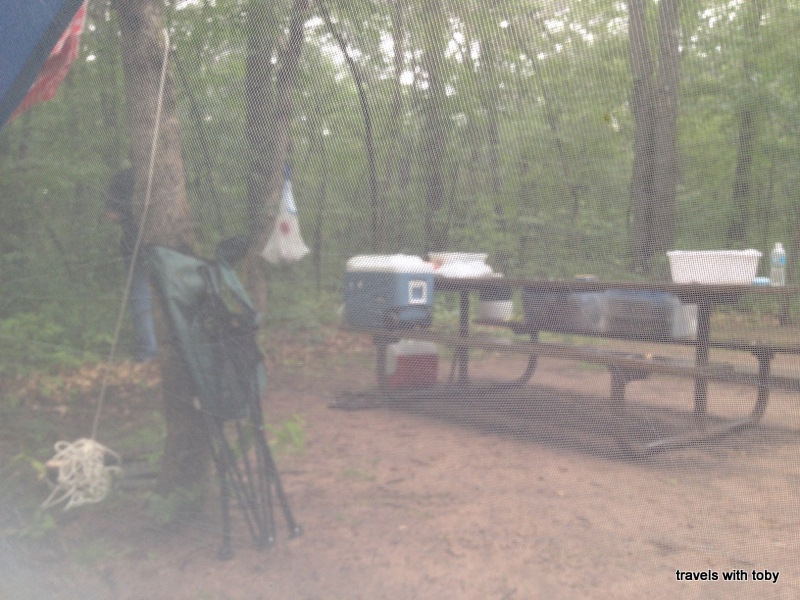 Naturally we wondered if it was raining at the campground.  We weren’t sure we had secured anything that might get wet.  It did rain a little but all seemed well.  We started to talk about making dinner when it started to rain again.  Miss M and I hid out in the tent and hubby later joined us when it didn’t stop after 5 or so minutes.  We sat in there for about 20 minutes while it rained.  It was actually quite pleasant.  Here’s the view from the tent:
