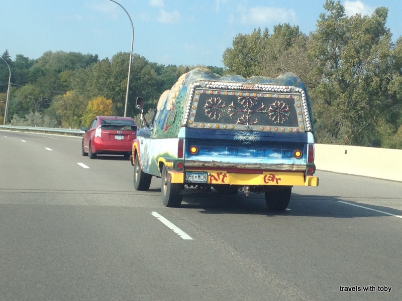 Check out the art car, so stated on its bumper.  On top is a person who appears to be hanging onto the car so he doesn’t fall.  I wish I had kept my camera on when we passed because I didn’t get a photo of the front of the vehicle, which turns out to be an old pickup.  The person’s face is right above the windshield and it’s got this huge nose!! Ah well,  you can still get the gist of it.  Amazing the things we find when we’re observant :)