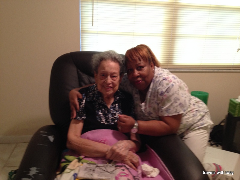 We were truly blessed and managed to get just about everything done by the deadlines. We had one snag today with turning off the water. I didn’t realize that I had to do it in the apartment so Miss M and I went back to do that this afternoon however it was not to be. For some reason, today the deadbolt would not budge. We used it the entire time we were there. Two nice gentlemen tried to help by spraying WD40 in the lock and then using a tool to try to pry the deadbolt out of the door jamb, to no avail. One of them said he thought the pin broke. The management company is going to get in there on Monday to turn off the water for us. Thank goodness because I’m not sure I’d be able to sleep tonight. Other than this last snag, everything went fairly well. We had awesome people along the way, from the lovely folks at the UPS store to the funny guy at the U-Haul place, the awesome Salvation Army team who took many things that we donated and finally the great company that hauled away the damaged furniture that Salvation Army didn’t take. And Mom is safe and happy in Virginia with my sister and her family. Finally, I’d like to share a photo of Mom and Merline, her aide of nearly three years. This was her last day in Florida.