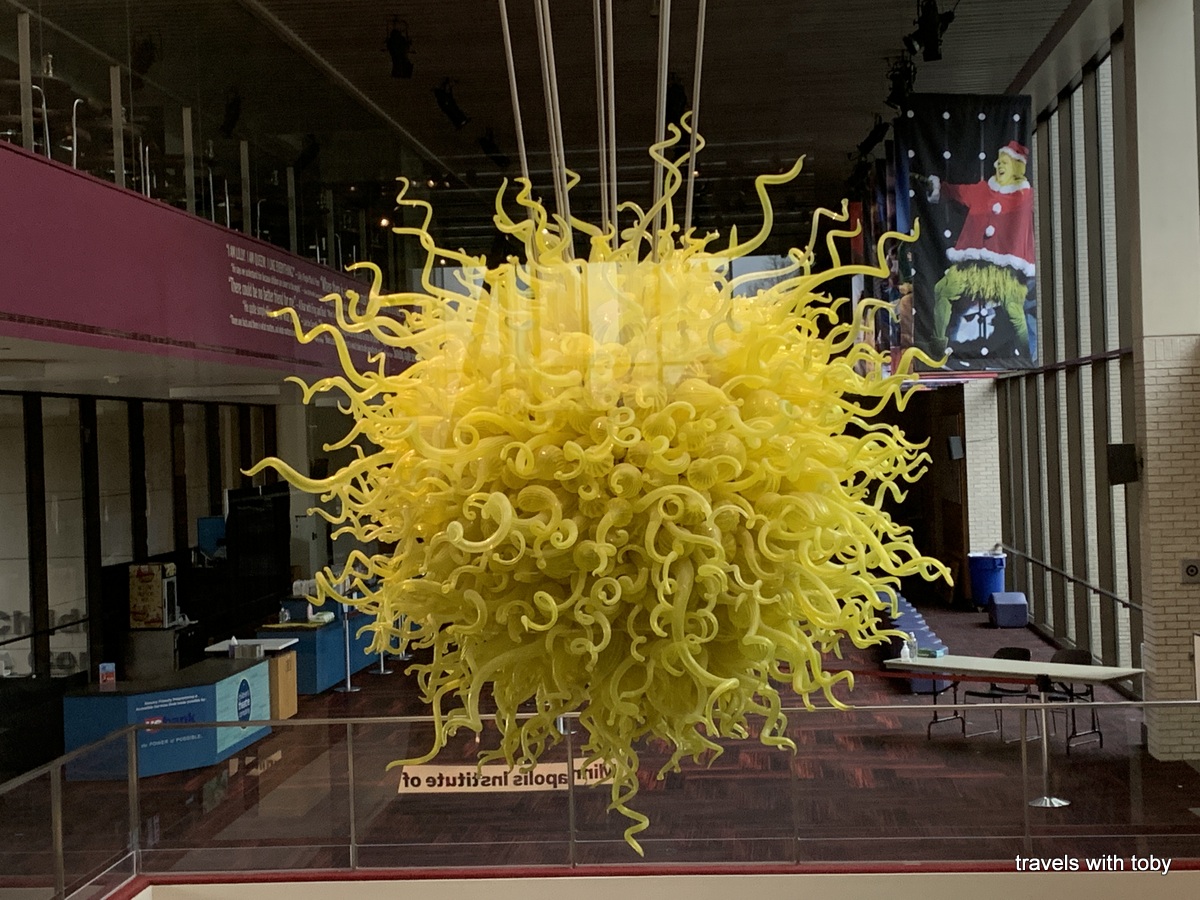 Another delight at MIA is Chihuly’s Sunburst that greets you when you walk in and it’s the last thing you see as you leave, as long as you look up. In previous visits we had lunch at the Agra Culture restaurant on the mezzanine level. The view of Sunburst is especially wonderful while you’re eating lunch. But Agra Culture is closed until further notice due to the pandemic.