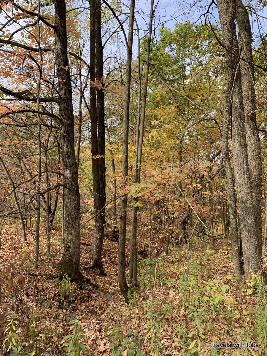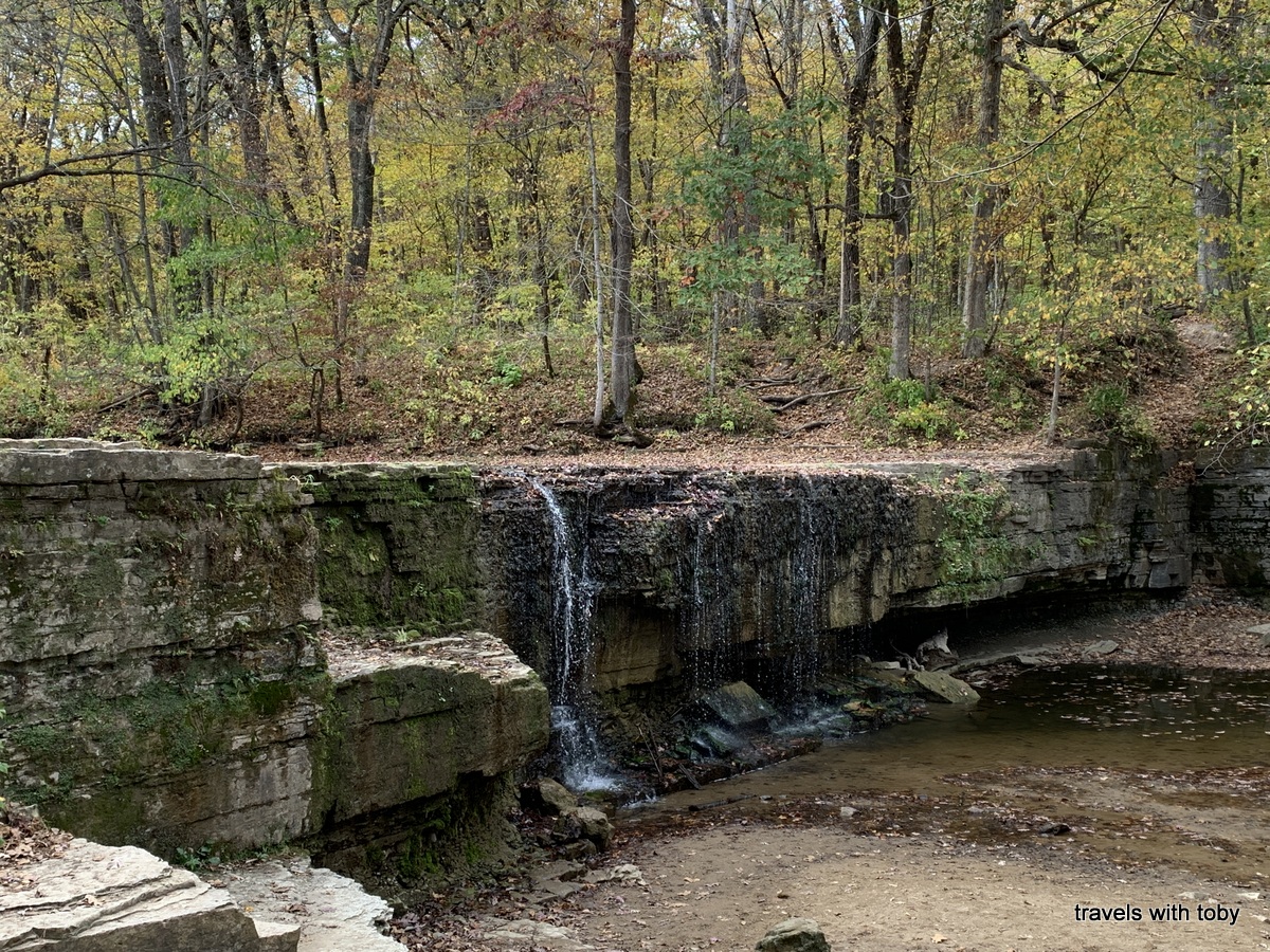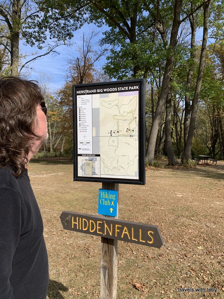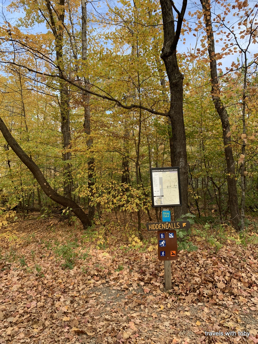 We timed this adventure perfectly and were treated to scenery filled with fields of dried up corn stalks and some empty fields where we think corn had grown and farms galore along with colorful trees as we headed south with our destination about an hour away. It was a nice day for a drive and then a hike at this state park to find waterfalls. Temp was mid 60s, perfect for a hike.