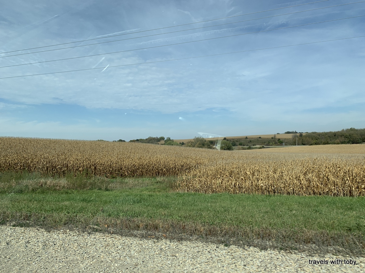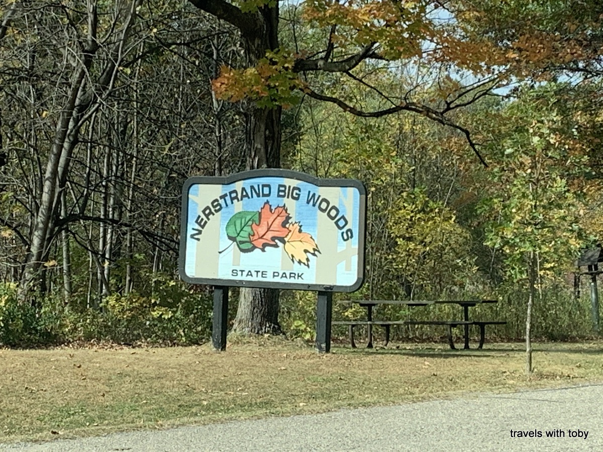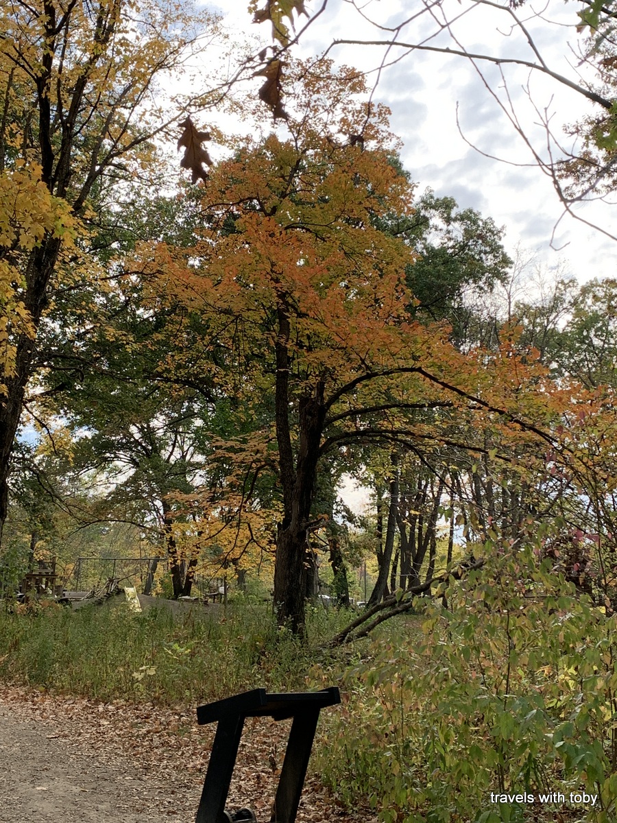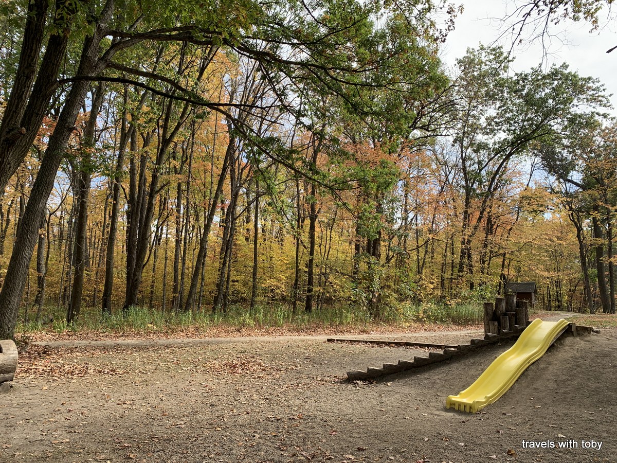 We timed this adventure perfectly and were treated to scenery filled with fields of dried up corn stalks and some empty fields where we think corn had grown and farms galore along with colorful trees as we headed south with our destination about an hour away. It was a nice day for a drive and then a hike at this state park to find waterfalls. Temp was mid 60s, perfect for a hike.