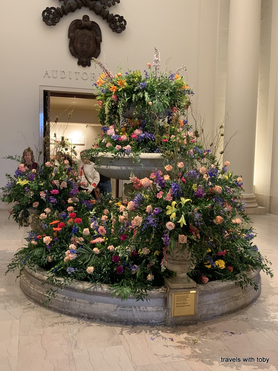 Since I just retired I planned to go the first day at opening time, rather than on the weekend when it would be more crowded. I guess I should have known that since Art in Bloom hasn’t been held in three years that it would be busy. But I had no idea we wouldn’t be able to park! Their parking lot was full and all the spots on the streets were taken. They were offering valet parking for $20 but we thought we could just come back later. And that ended up being the next day after lunch.