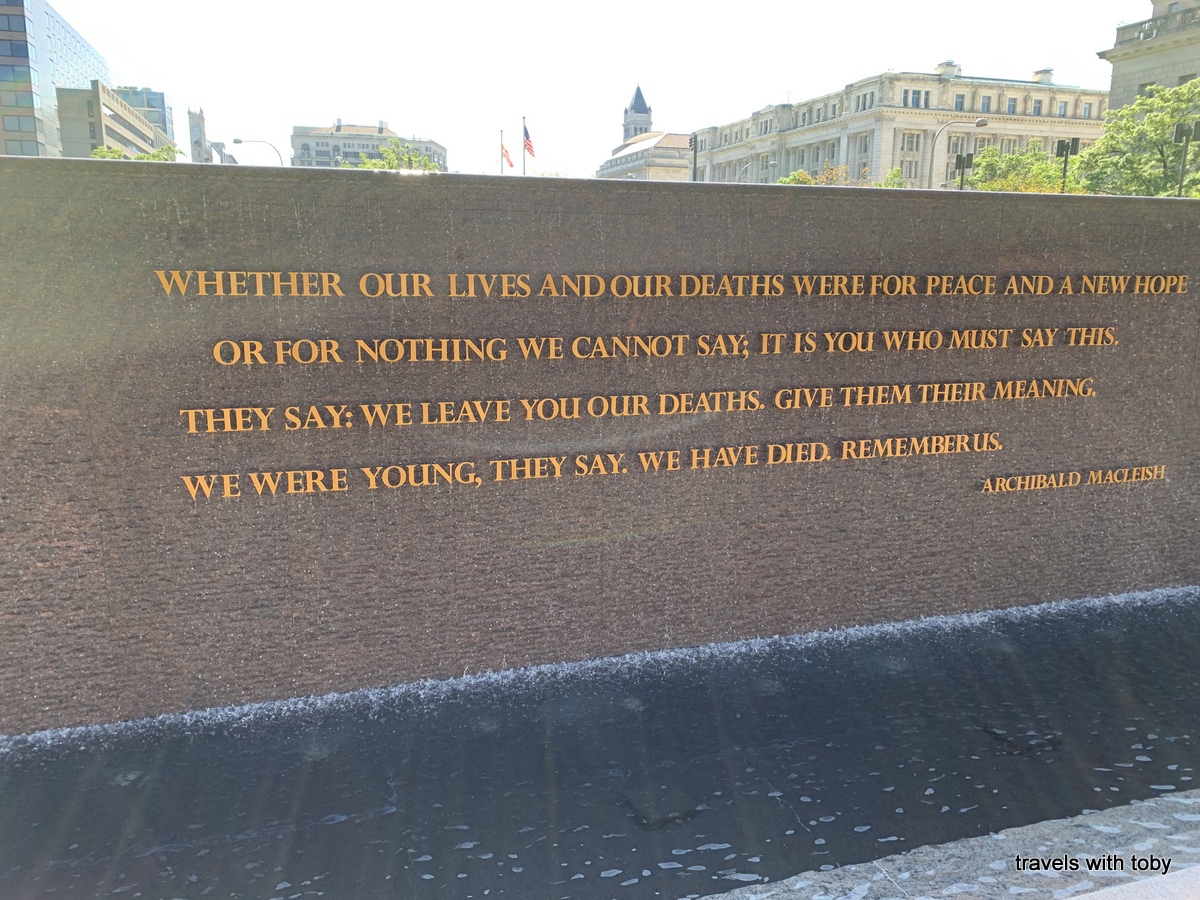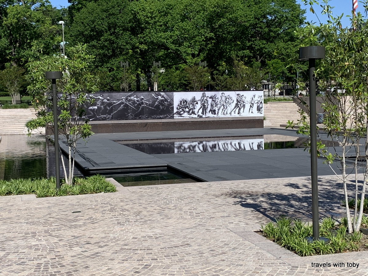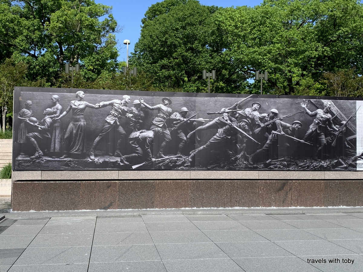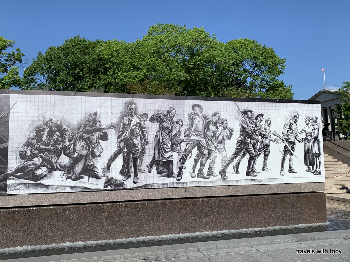 Oh, I forgot to mention that on our way to today’s events we happened upon the new World War I memorial. It’s in Pershing Park which is in between the Willard Hotel and the White House Visitors Center and about a block away from the White House. The American flag was raised over the World War I Memorial for the first time on Friday, April 16, 2021 at the formal unveiling of the memorial. The sculpture “A soldier’s journey” is scheduled for installation in 2024. In the meantime you see a photo of it on a wall and it is quite moving. Here are the photos that I took.