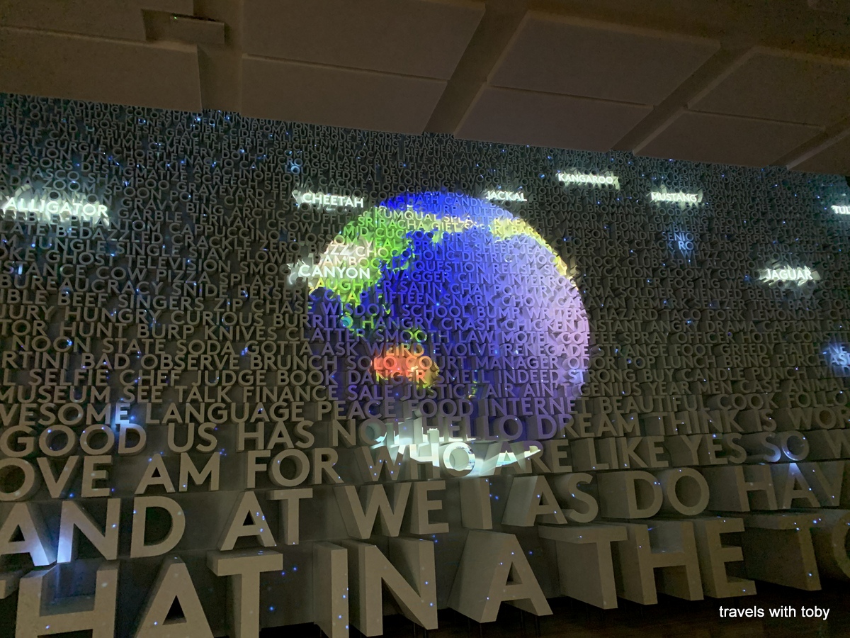 We had a lot of fun and learned many things about languages, like where words come from in the English language and I now know what a portmanteau is. We also learned how language is used in advertising. There were some quiz sections that I didn’t do very well with but they were fun to try nonetheless. There was a room with a display of books. When you place a book in a specific spot, a recording tells you all about that book. It was really fun to try all the interactive exhibits. Do go if you’re in the D.C. area. A bonus for us was that it was a 5 minute walk from our hotel. Here’s a link to their website in case anyone would like to visit. Following is a gallery of photos I took in the museum.