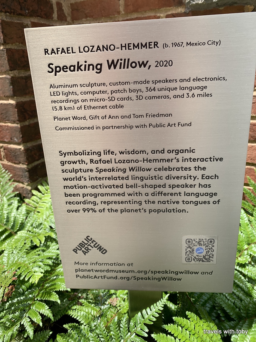 As you arrive, you are greeted by the Speaking Willow. As you pass under it you hear people speaking in all sorts of languages. The piece is designed to activate when people pass by. This is the first of many interactive exhibits in this unique museum. Very cool!! Here’s a bit more information about the Speaking Willow: