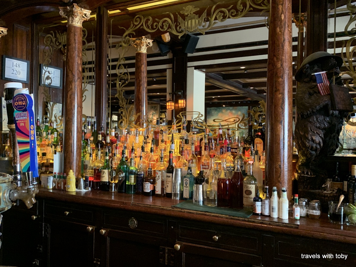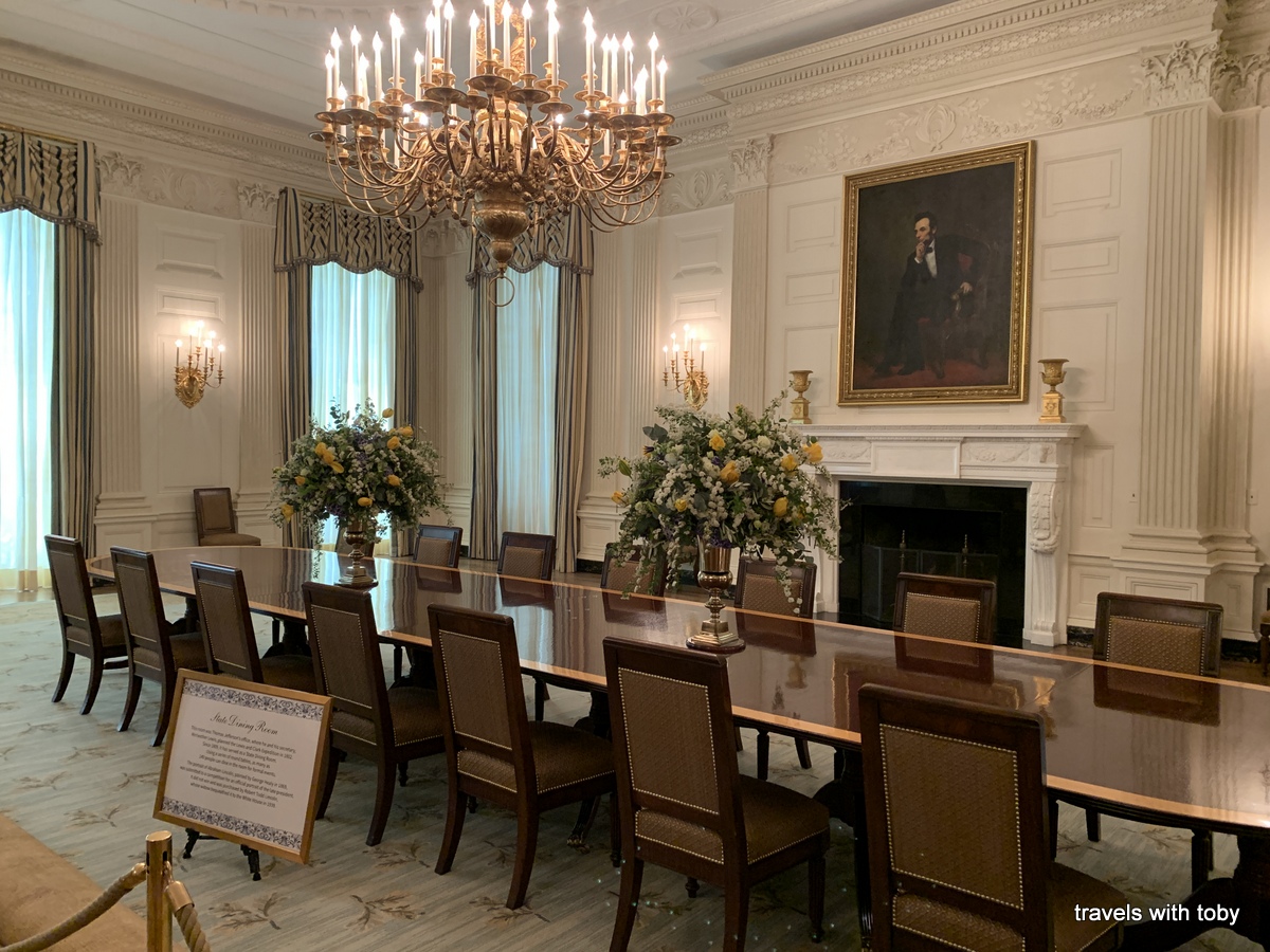 We had passes to tour the White House and needed to be there at 11:15 so I timed breakfast for 9:00. I figured that we’d finish eating well before 11:15 and Old Ebbitt’s Grill is about a half a block from where we were to enter the White House grounds for our tour. So we walked from breakfast, hung out at the bar and conversed with the very nice bar tender until it was time for our tour. Did I mention the great service already? Considering all the restaurants that we visited, Old Ebbitt’s really does it right. Hubby noticed a hand-written letter in a frame hanging near where we were sitting. It’s from Buffalo Bill Cody in 1886 and written on Old Ebbitt stationery. Very cool! I mentioned in an earlier post that some of Teddy Roosevelt’s hunting trophies are hung in the bar so you’ll get to see a close-up of one of those in the photos that follow. Also included in this gallery is a photo of a piece of the huge Black Lives Matter painted on 16th Street behind the White House. The two blocks where this resides was renamed Black Lives Matter Plaza in June 2020. It’s impossible to capture the entire thing from the ground. That could be something to look into for our next trip to D.C.: how to see the entire street from above. Also on our walk to Old Ebbitt’s was a placard about how Dolley Madison saved George Washington’s portrait when the British attacked Washington, D.C. in 1814. You’ll see that portrait in the White House gallery below.