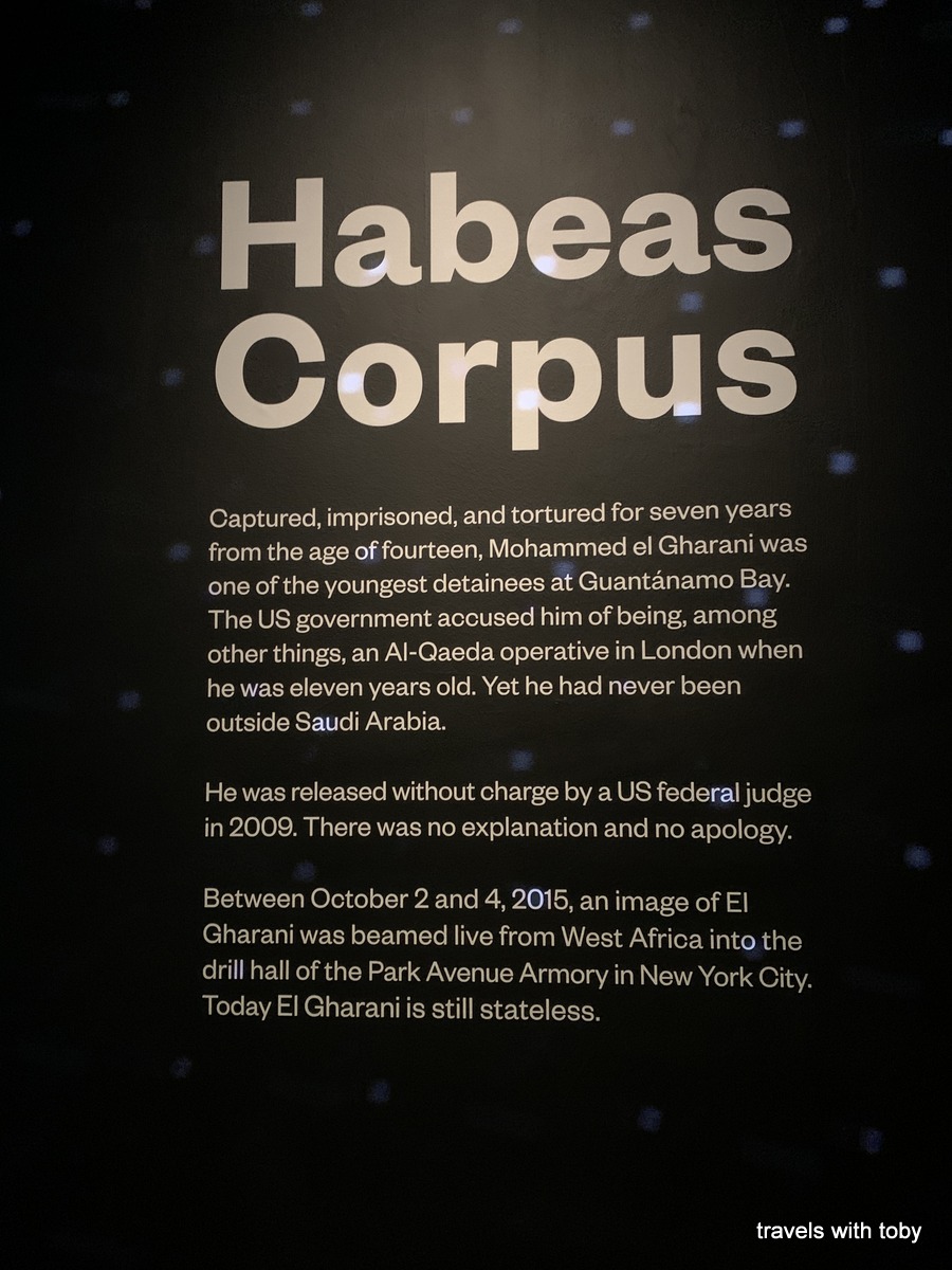 Gallery 6 consisted of very large pieces that she painted. Gallery 7 was entitled Habeas Corpus. Inside this gallery was a film narrated by Muhammed el Gharani who was captured at age 14 and imprisoned and tortured at Guantanamo for 7 years. He was released without explanation or apology. A sad commentary to be sure.
