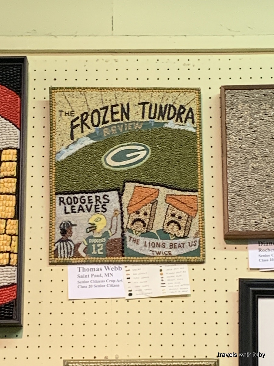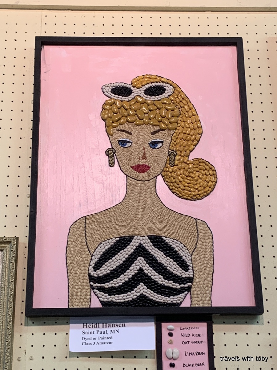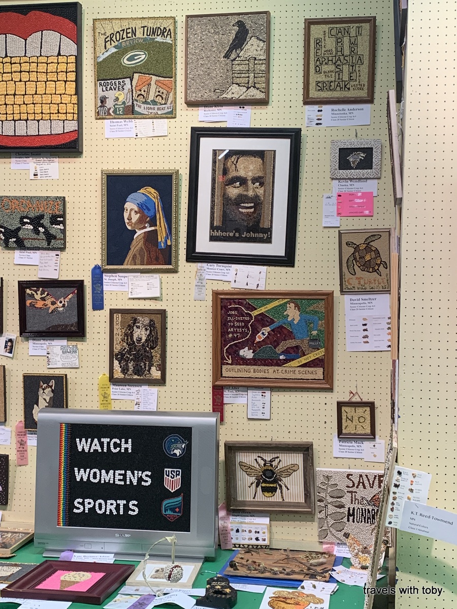 We started our day at The Peg, the only sit down restaurant at the fair. The food’s pretty good but the wait this year was not the best. But eat we did and onward into the Horticulture Building because we all wanted to see the crop art. It was pretty busy for opening day this year so of course there was a line to see the art. But it is so worth it!! Lots of great entries again this year. I even captured an artist creating a piece of crop art. Here’s my first gallery of photos. Click on any image to scroll through the photos and view captions.