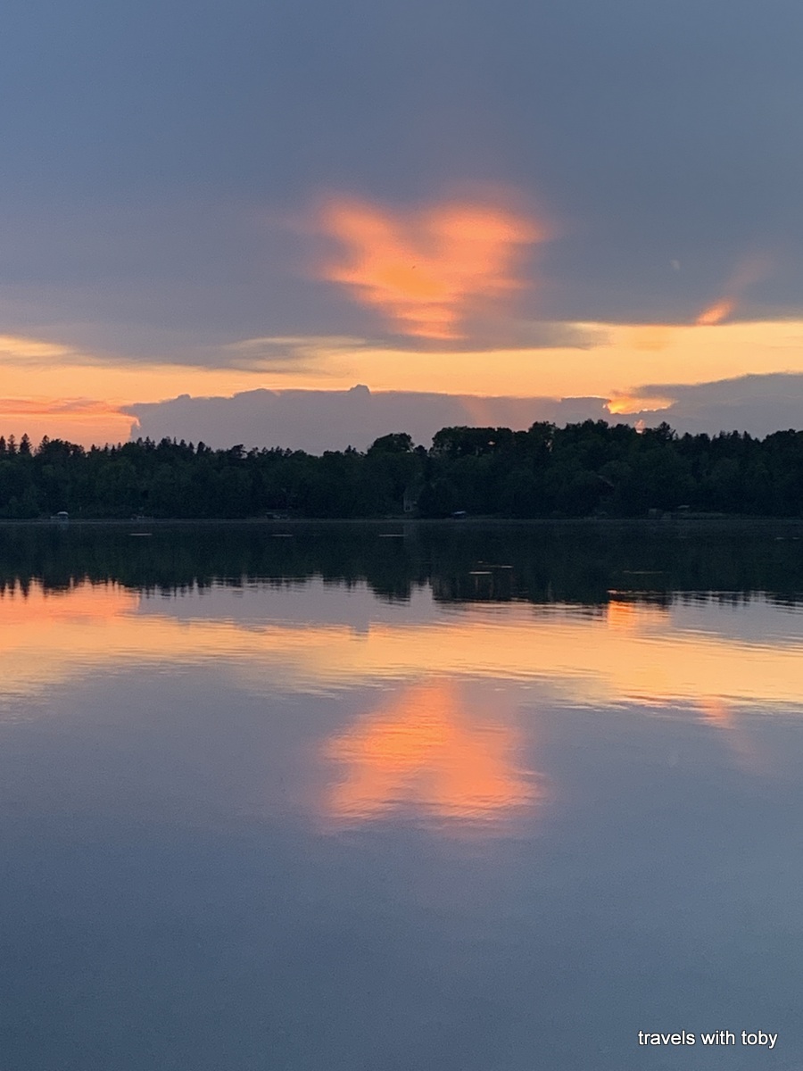 In May my mother-in-law was laid to rest. The night before her burial four of us were at the family cabin and I could see that a nice sunset was materializing. But I was so surprised when I got down to the shore to see a heart-shaped pink cloud in the sky with an accompanying reflection in the water. We were all so amazed at this sight as none of us had ever seen a heart-shaped cloud. We all felt that Joyce was smiling down on us and she so loved sunsets at the cabin. My sister-in-law loved the photo so much that she created a larger photo on a framed canvas-type material and displayed it at Joyce’s memorial in July.