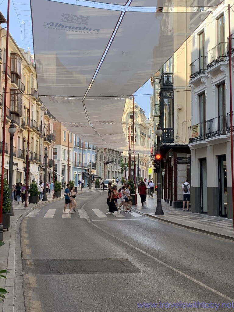 Yes, indeed, Spain is truly a tourist haven. They do seem to know on what side their bread is buttered… I thought the shading over the streets in your pic was interesting. Perhaps the waiter wanted to sell you a house wine… All in all, seems like a great trip! Looking forward to the Alhambra!