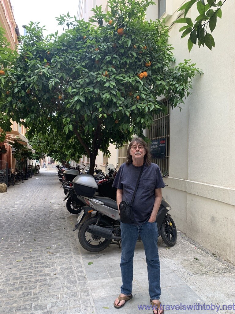 I was craving a salad so we headed down Calle Navas and found Nuevo Restaurante and the salad I wanted was on their menu. We headed indoors because there weren’t any tables on the patio and right away a gentleman asked “para comer?” (do you want to eat?) and when I said yes he led us through the restaurant and out the back door to another patio. It was lovely and there was a row of orange trees with an abundance of oranges. There was one other American couple with I’d guess one of their mothers having lunch. They were having the same salad I ordered. Oh my, it was super!! And just what I wanted. The service was excellent too with friendly wait staff who let me speak Spanish. And oh yes, we got served a yummy tapa of some sort of beef with skinny potato chips. That was delicious too!