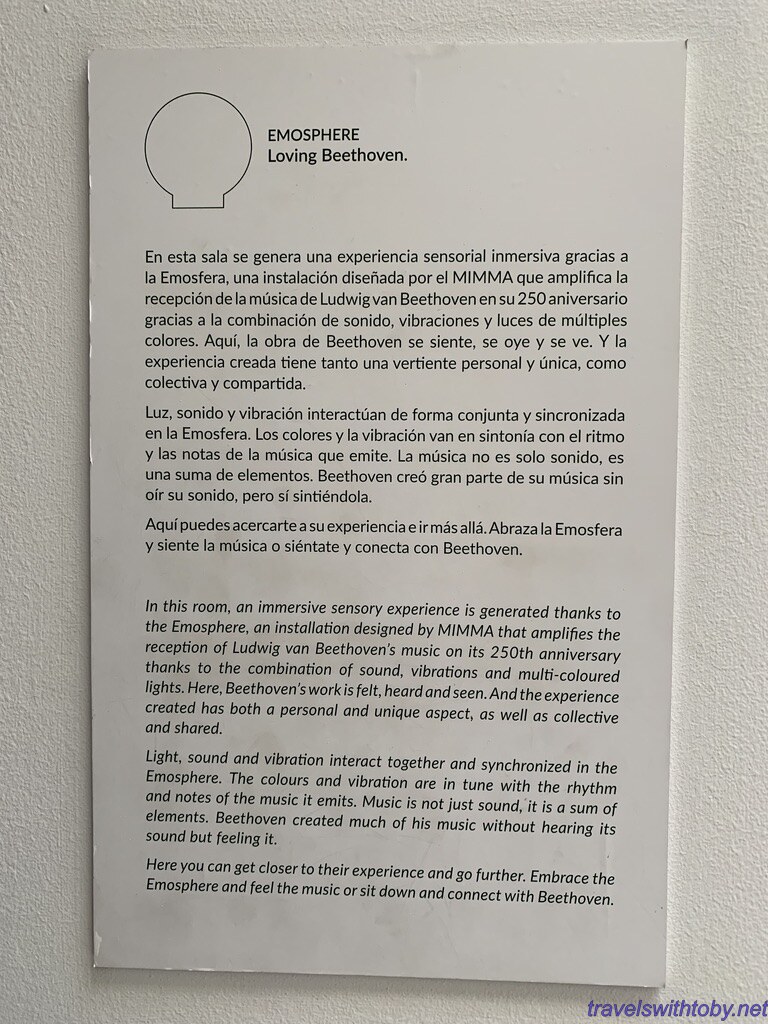 At the end was a small room with a huge ball and Beethoven’s music playing. This was in honor of Beethoven’s 250th birthday and the idea is to experience the light, sound and vibration of the music. I’m not sure I could feel the music but it sounded great! And it was a pleasant place to relax and listen to the music as we absorbed all that we viewed during our visit.