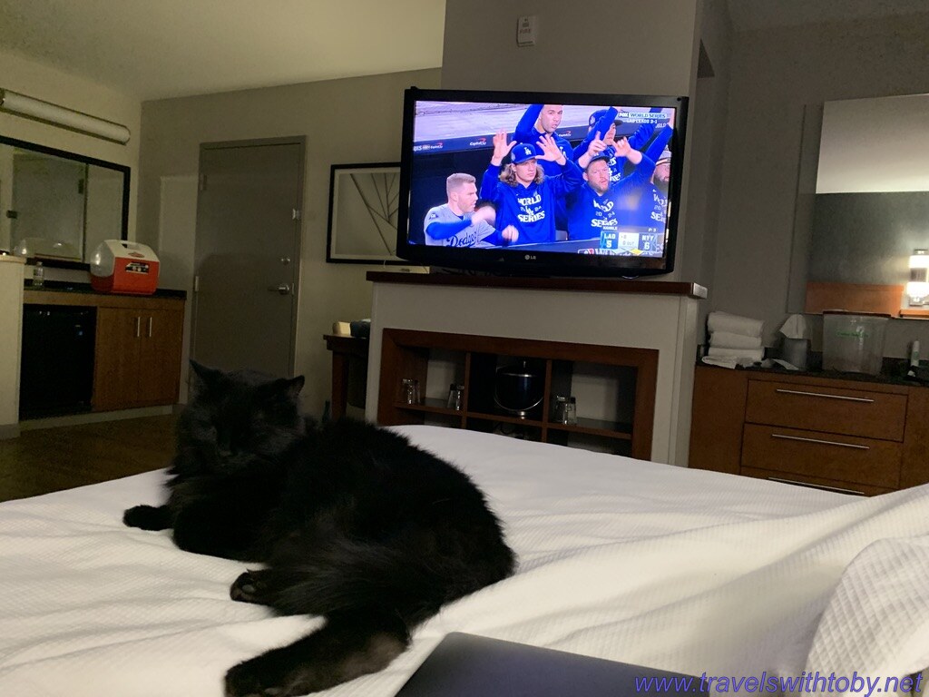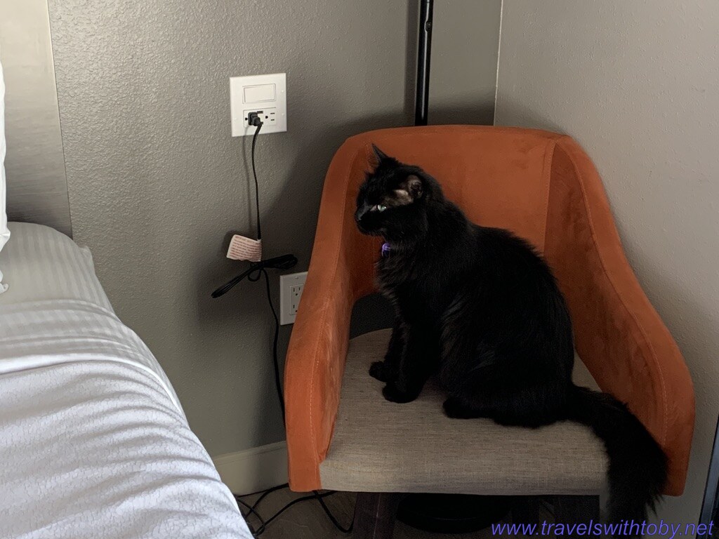 It was our first time on the road with our very sensitive cat, Frankie. He turned out to be the world’s best little traveller! He’d curl up on the console next to me and sleep the entire drive. Our vet gave us drugs to relax Frankie and I thought it might be a good idea to give it to him before bedtime so that he wouldn’t wake us up in the middle of the night. That didn’t work so well the first night as he could tell there was something in his food and refused to eat it, so I didn’t attempt that again. After the first two days we got our routine down for Frankie. We’d get to the hotel, check-in, then park near our room and bring the cat in with his litter box and food. Give him water right away and then feed him. He would then check out every inch of every room we stayed in and he didn’t meow that much. He was no trouble at all!