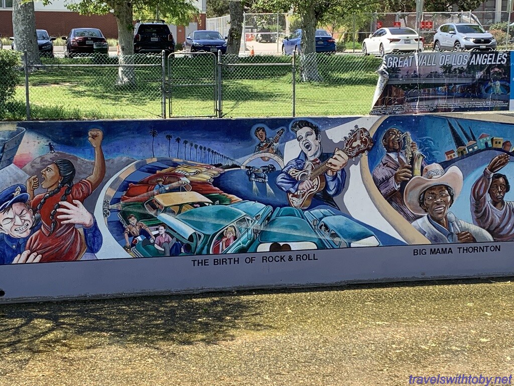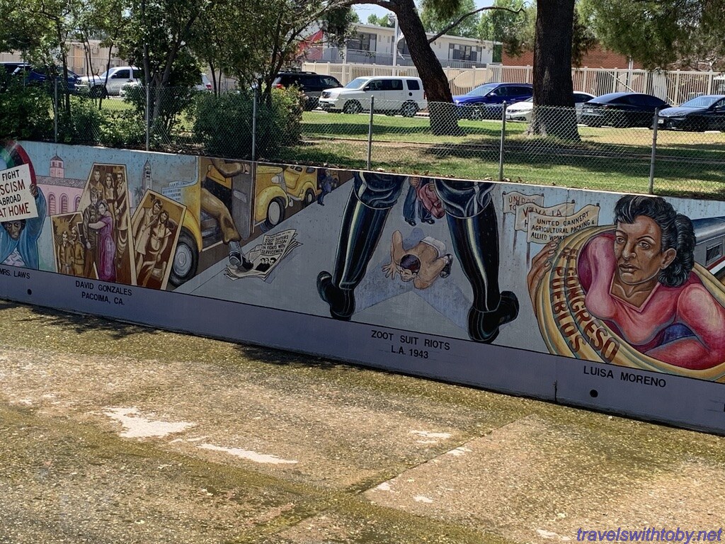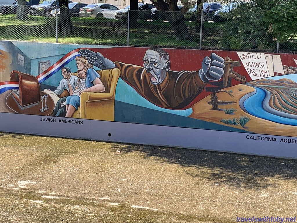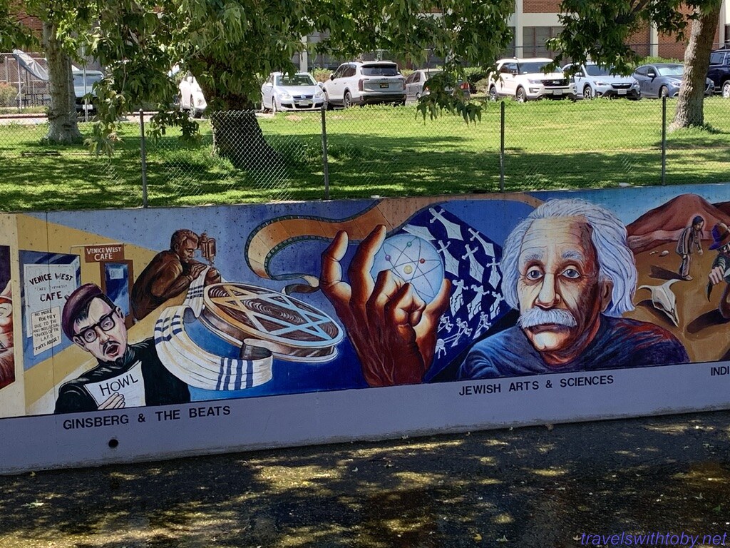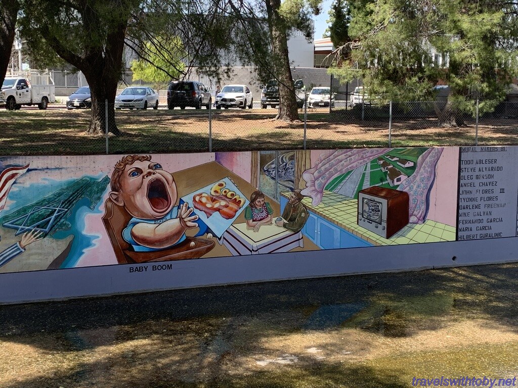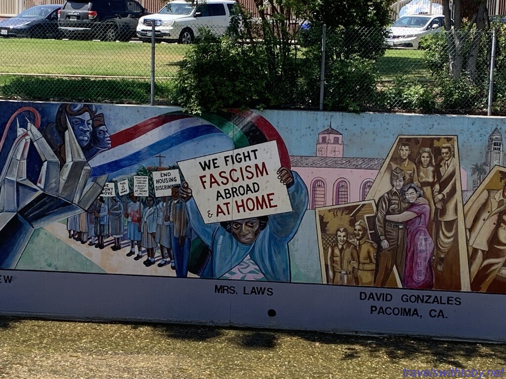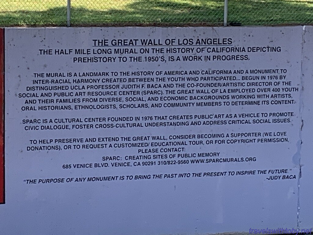 We visited twice because we didn’t know the how long it was on our first trip. I didn’t research it prior to going the first time, did so afterwards and learned it was a half mile long. We started at the more current end, at the corner of Oxnard Street and Coldwater Canyon, and worked our way backwards. On our second trip, we started at the beginning and followed it to where we stopped the week before. So interesting and so many great scenes. There are several spots with lists of the artists and I’ve included a photo of one of those.