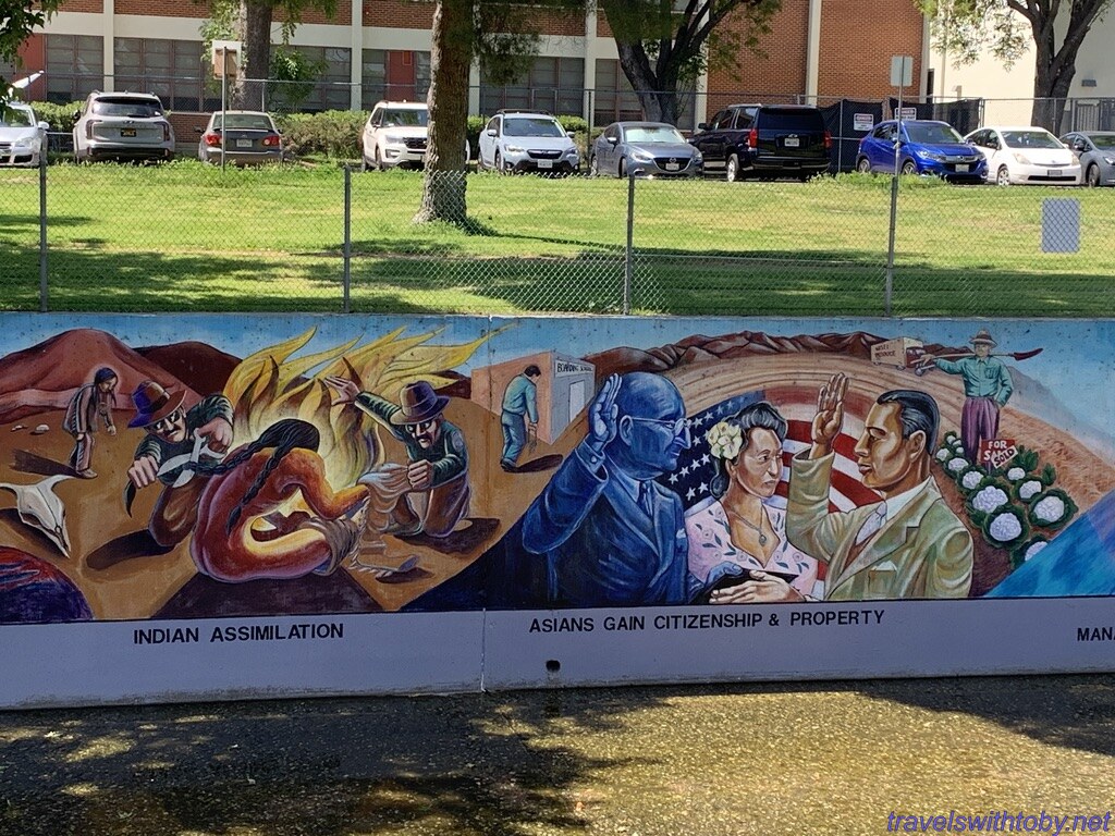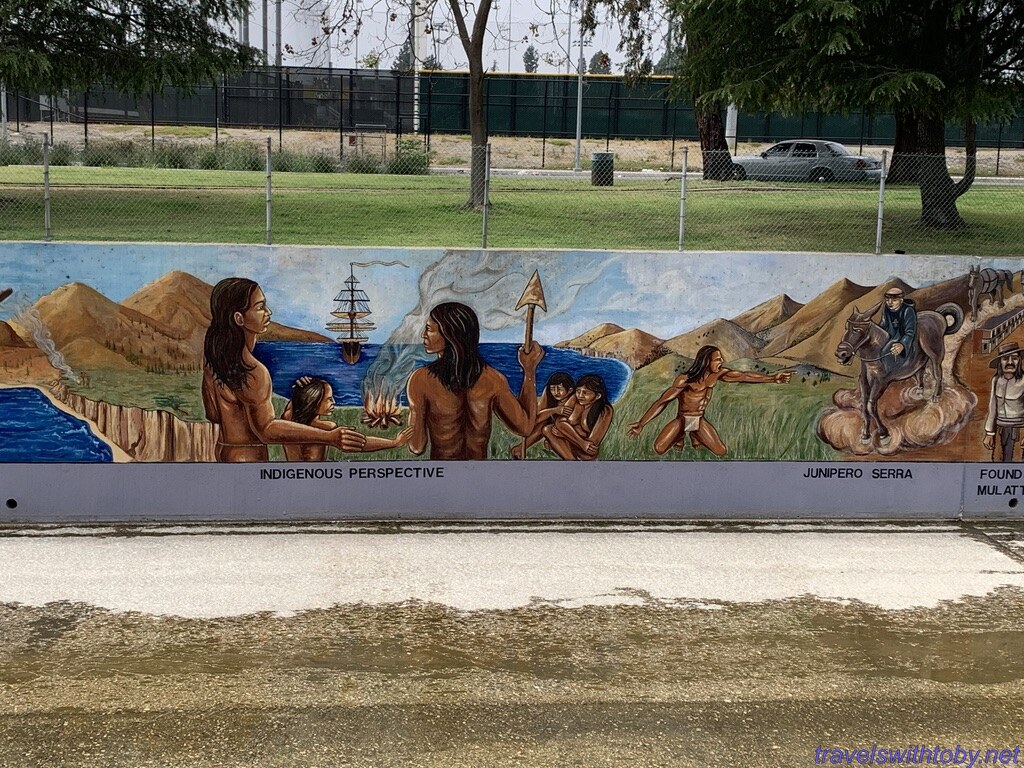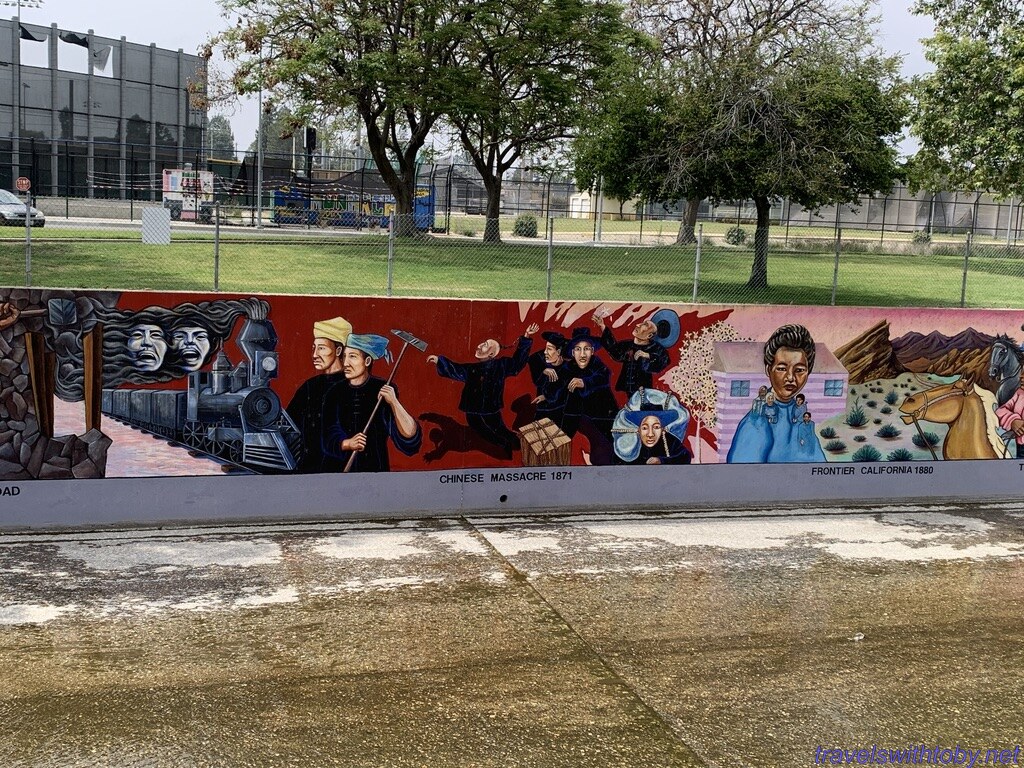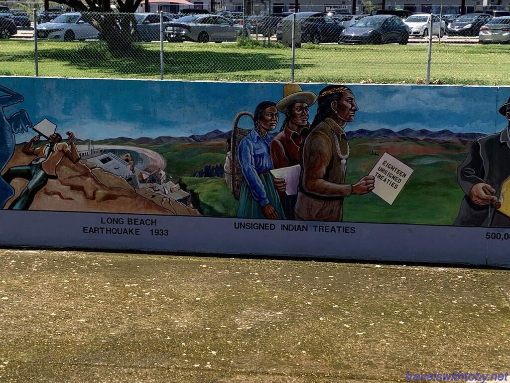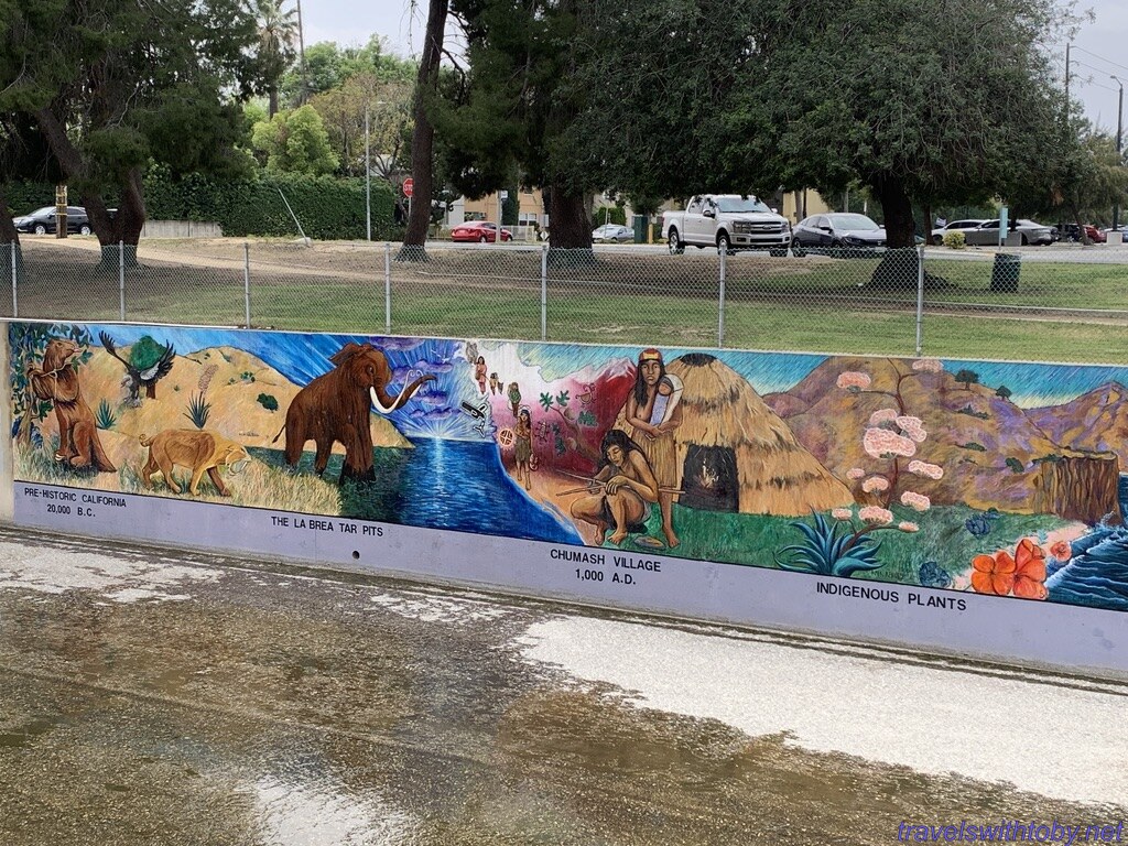 Created by SPARC, Social and Public Art Resource Center, The Great Wall is a half mile mural representing the history of ethnic peoples of California from prehistoric times to the 1950s. This section was completed in 1978. It is located at Oxnard Street and Coldwater Canyon Avenue in the southeastern corner of the San Fernando Valley in the Tujunga Flood Control Channel, also known as Tujunga wash.