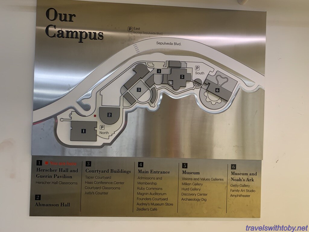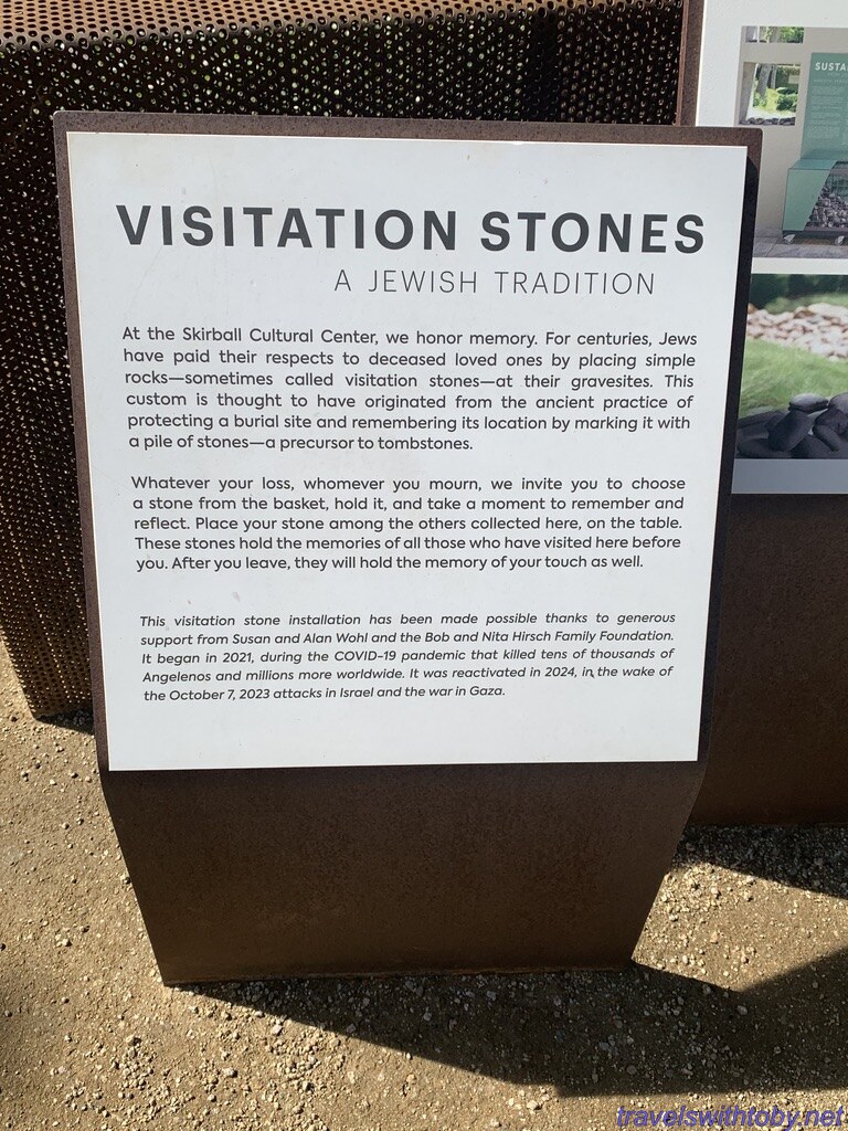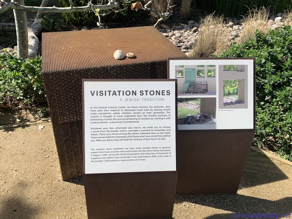 The parking structure is on the north side of the complex and it’s a lovely walk to the museum. There is a map of the campus in the garage and on the short walk to the museum there is an exhibit of Visitation Stones. It’s a way to honor deceased loved ones and comes from a Jewish tradition of placing stones on graves. They invite you to take a stone and hold it while reflecting on your loved one. Then you place the stone on the table.