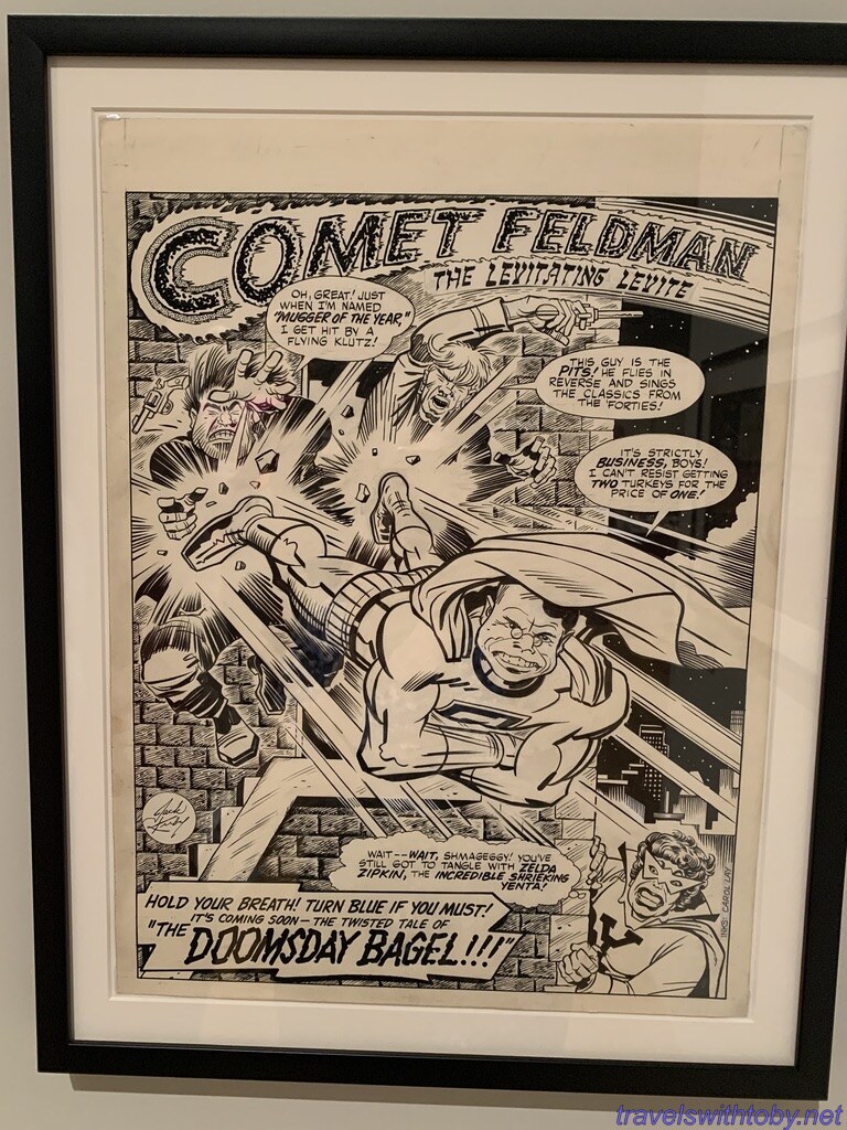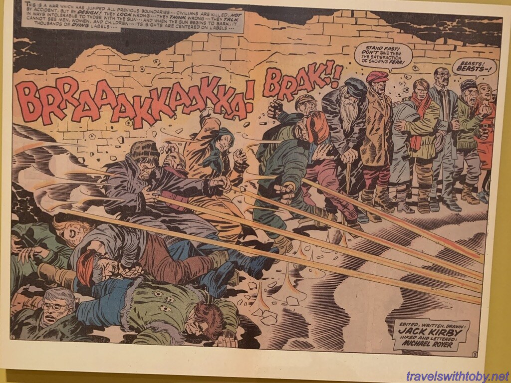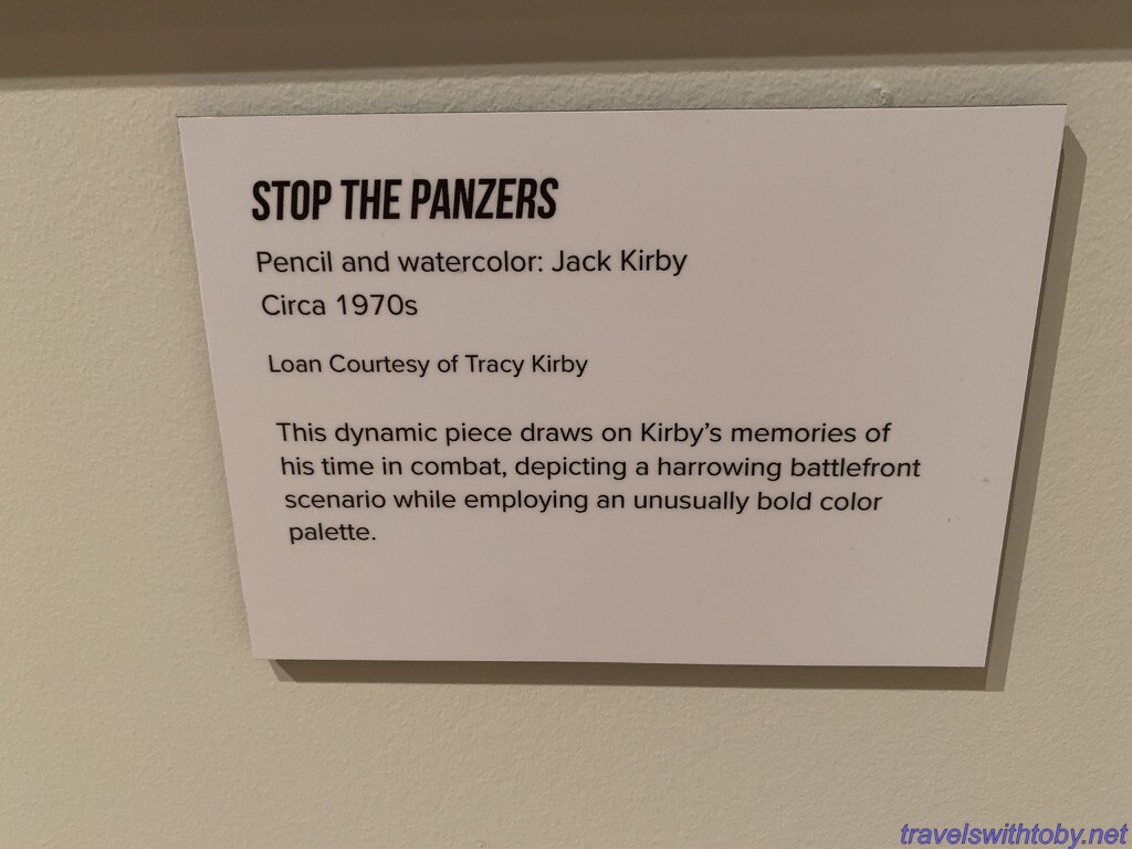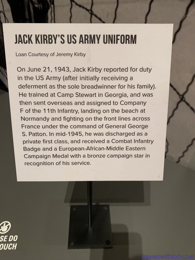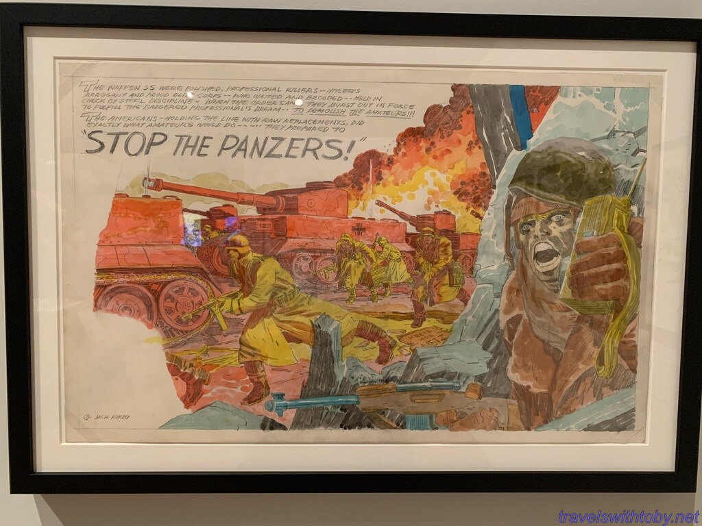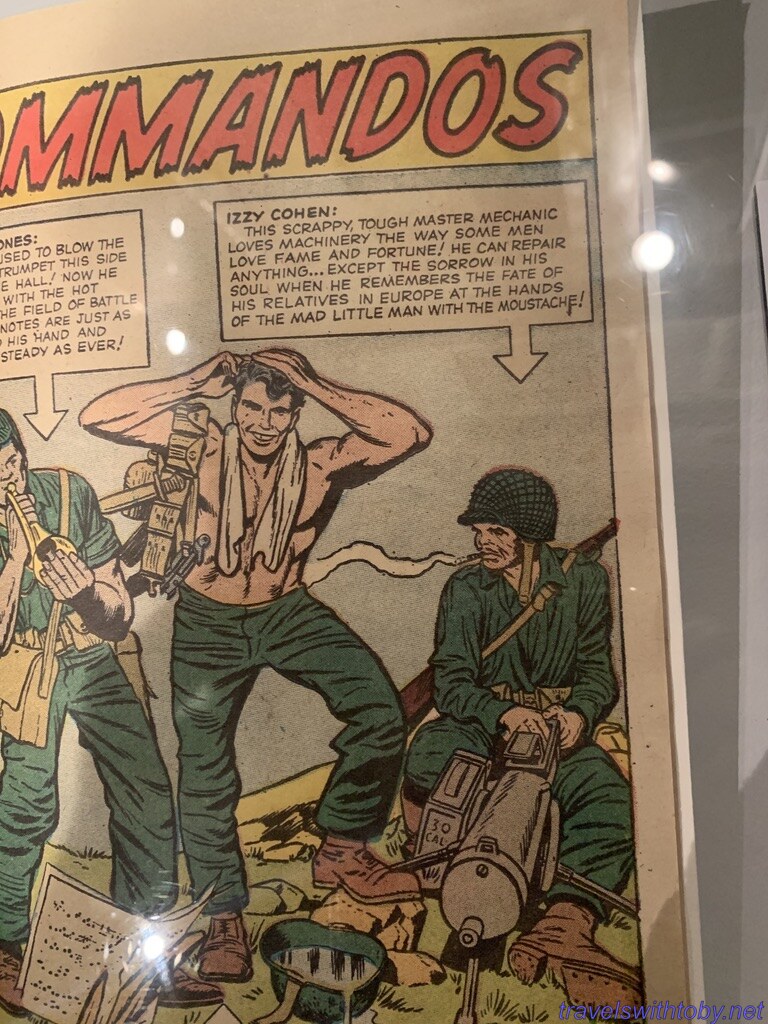 There was a section for World War II including Jack Kirby’s uniform next to a photo of him in the uniform. Some of his works were focused on the war. One comic had a character named Izzy Cohen which I took keen interest in. My father’s name was Izzy and was also in World War II. He was also a mechanic. If you read the blurb about him, you learn that Izzy was a mechanic so I was wondering if perhaps Kirby knew my father. But, after thinking about it, I doubt they knew each other because they were in different army units but both men landed on the beach at Normandy. I’d bet there were other Jewish servicemen named Izzy as it was a popular name at that time. Here is a gallery of the war-related pieces: