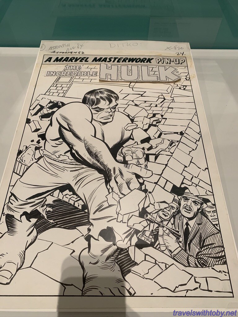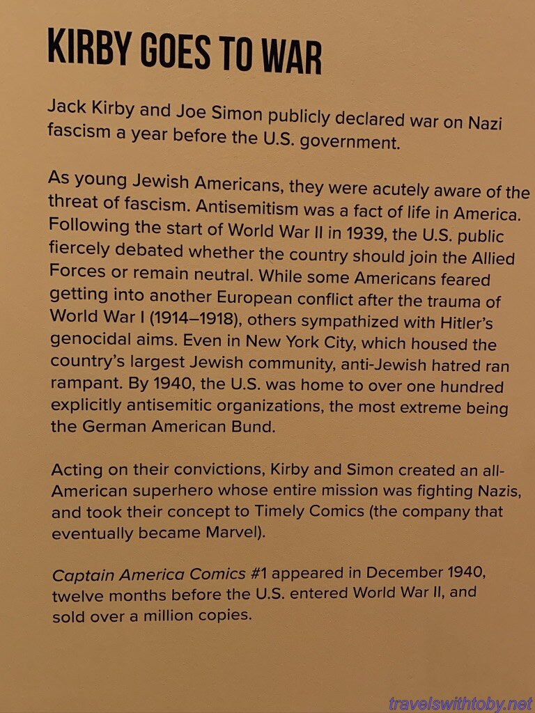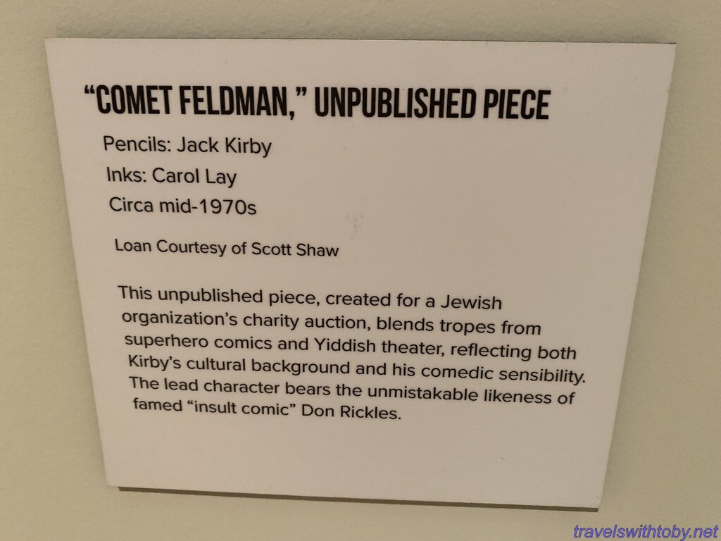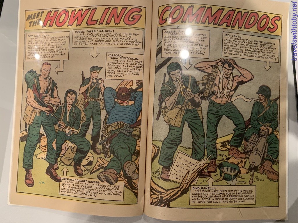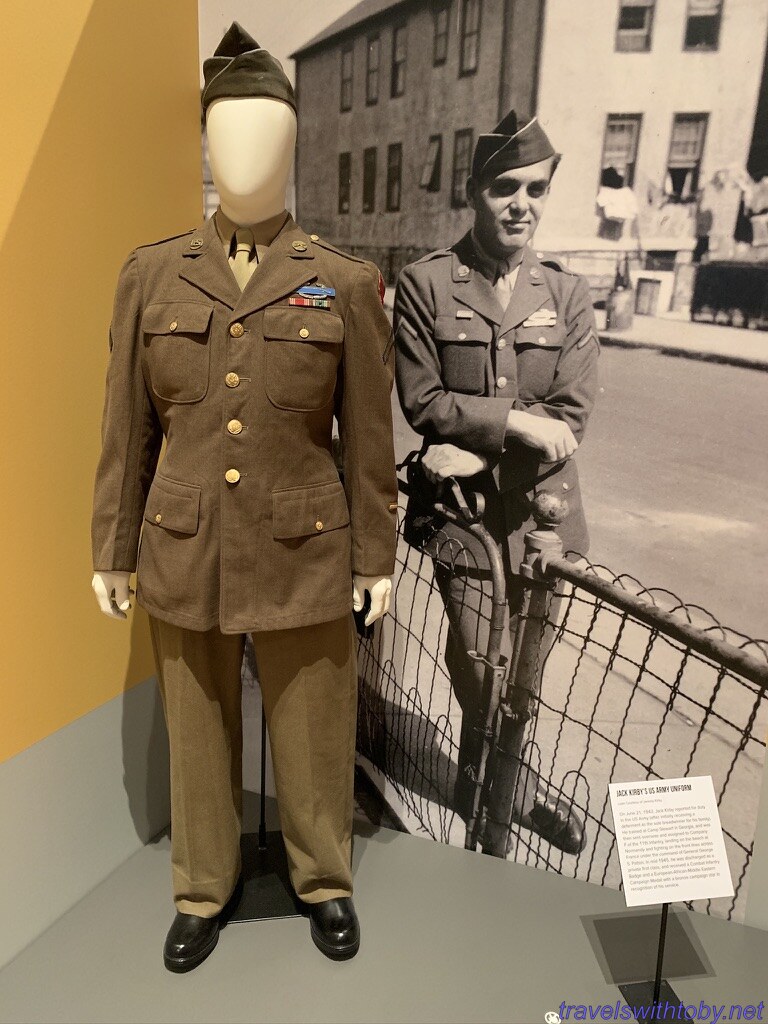There was a section for World War II including Jack Kirby’s uniform next to a photo of him in the uniform. Some of his works were focused on the war. One comic had a character named Izzy Cohen which I took keen interest in. My father’s name was Izzy and was also in World War II. He was also a mechanic. If you read the blurb about him, you learn that Izzy was a mechanic so I was wondering if perhaps Kirby knew my father. But, after thinking about it, I doubt they knew each other because they were in different army units but both men landed on the beach at Normandy. I’d bet there were other Jewish servicemen named Izzy as it was a popular name at that time. Here is a gallery of the war-related pieces: