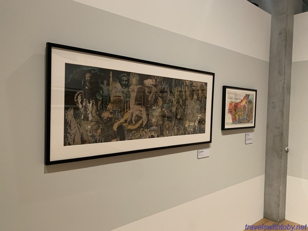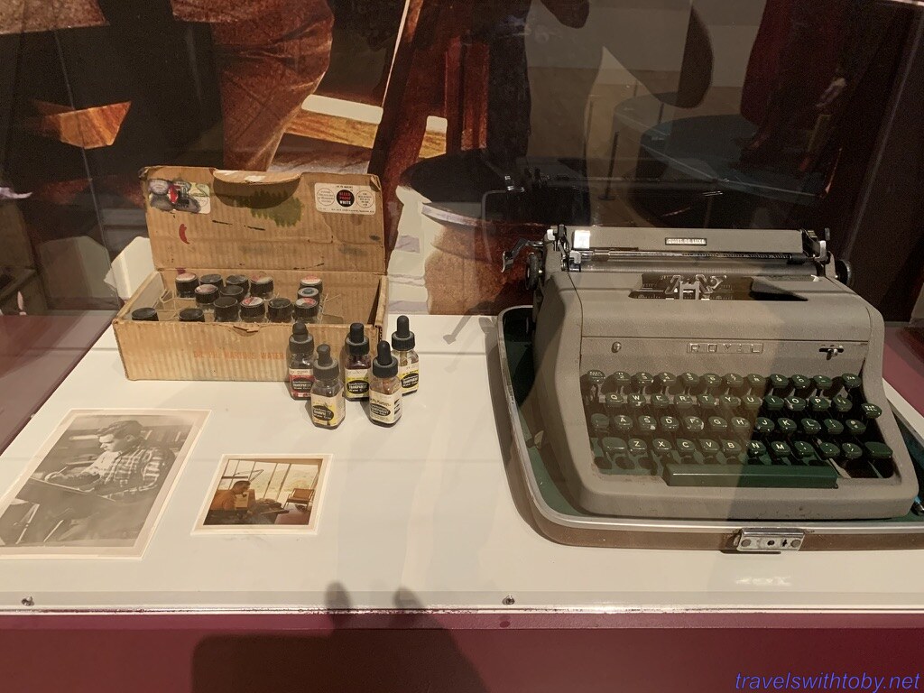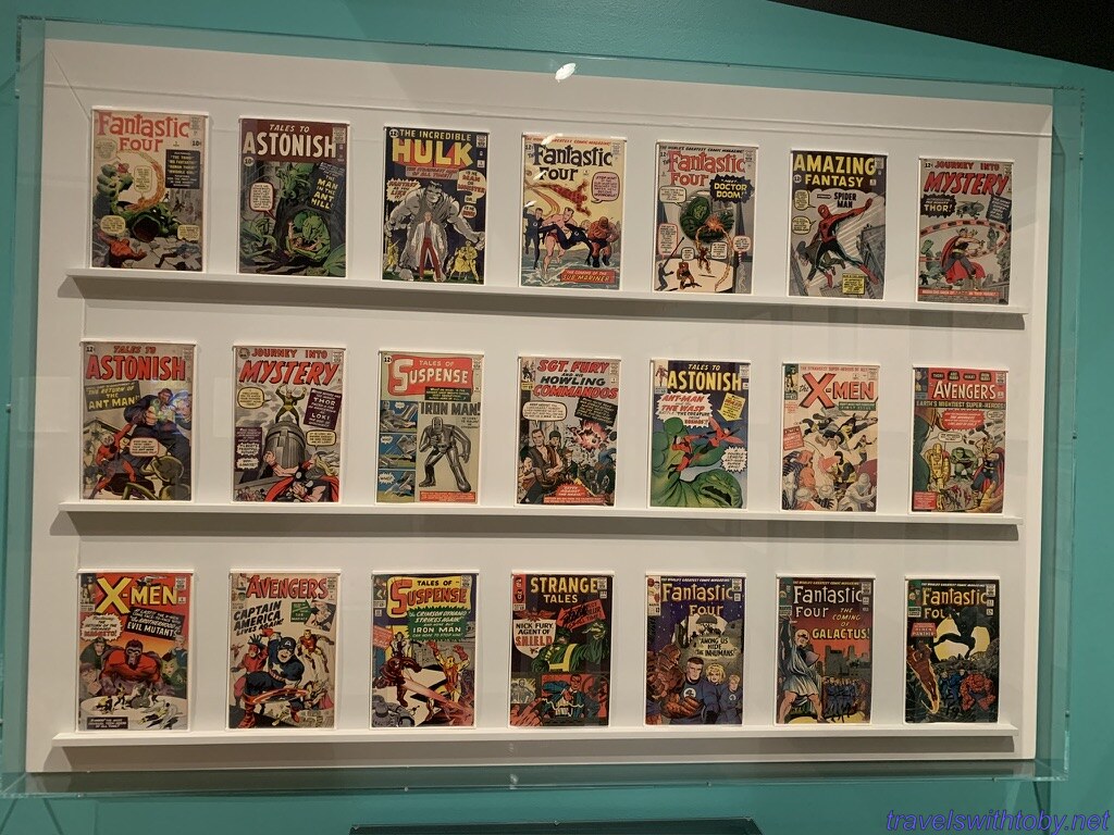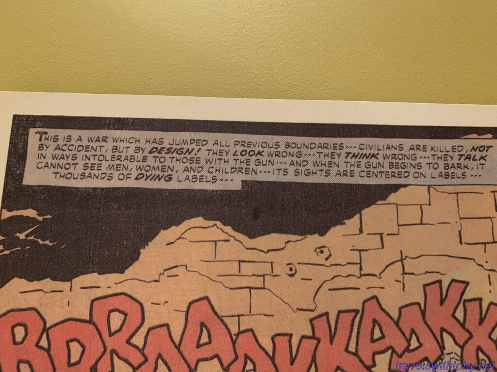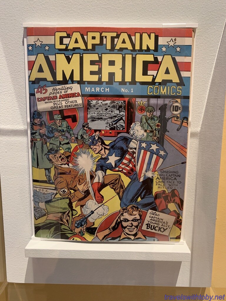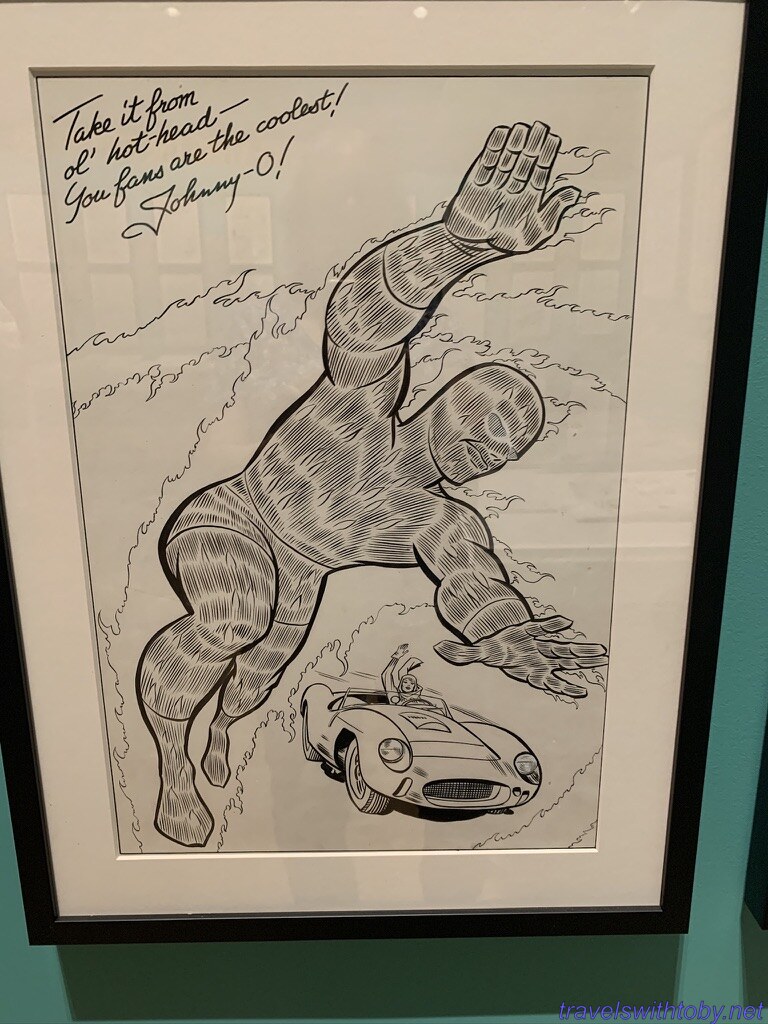 There was a section for World War II including Jack Kirby’s uniform next to a photo of him in the uniform. Some of his works were focused on the war. One comic had a character named Izzy Cohen which I took keen interest in. My father’s name was Izzy and was also in World War II. He was also a mechanic. If you read the blurb about him, you learn that Izzy was a mechanic so I was wondering if perhaps Kirby knew my father. But, after thinking about it, I doubt they knew each other because they were in different army units but both men landed on the beach at Normandy. I’d bet there were other Jewish servicemen named Izzy as it was a popular name at that time. Here is a gallery of the war-related pieces: